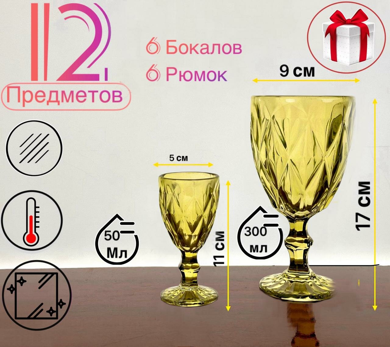 Набор бокалов и рюмок Посуда Мира из цветного стекла, 300 мл, 50 мл, 6+6 шт, Кубок, цвет золотой