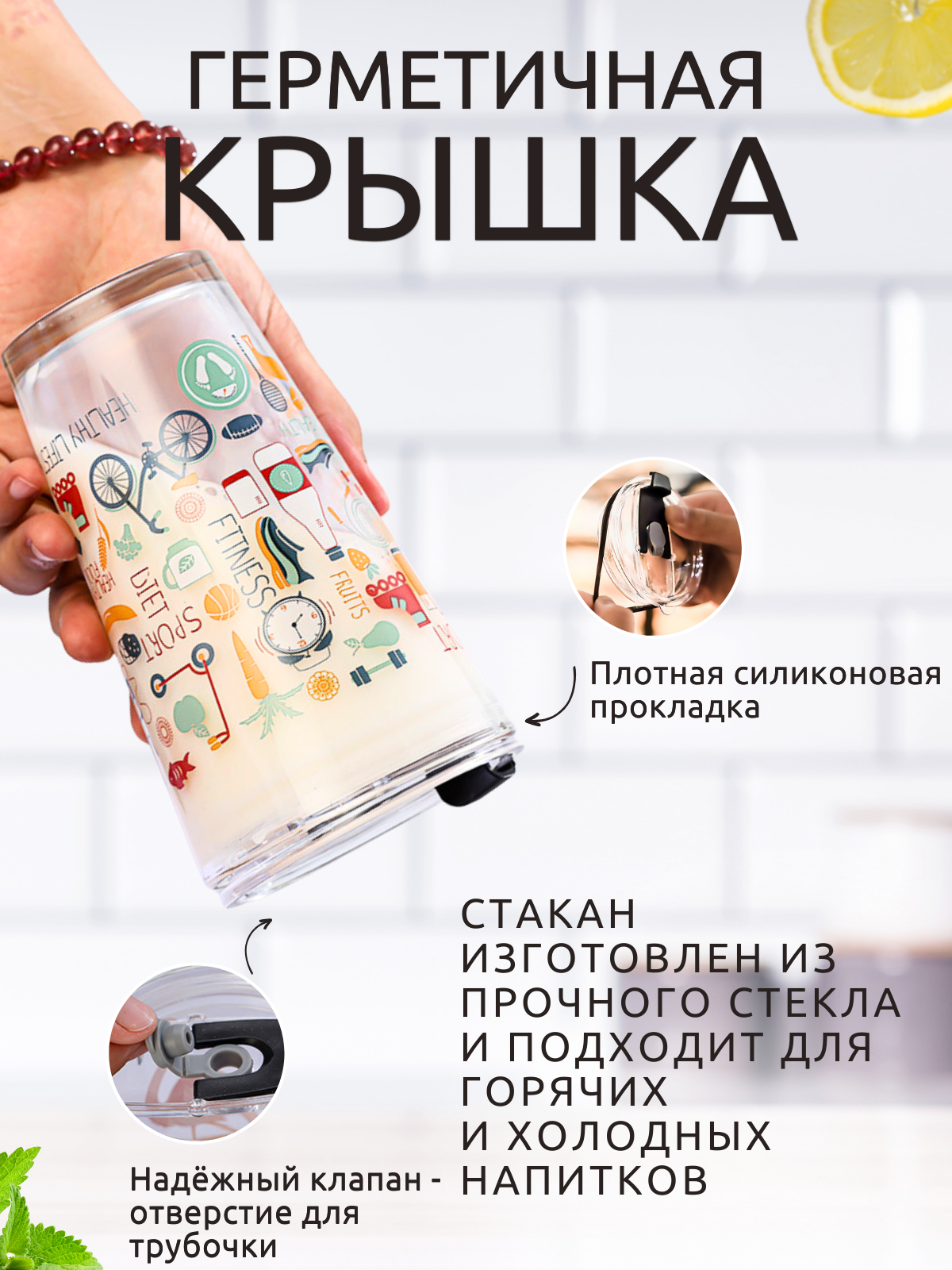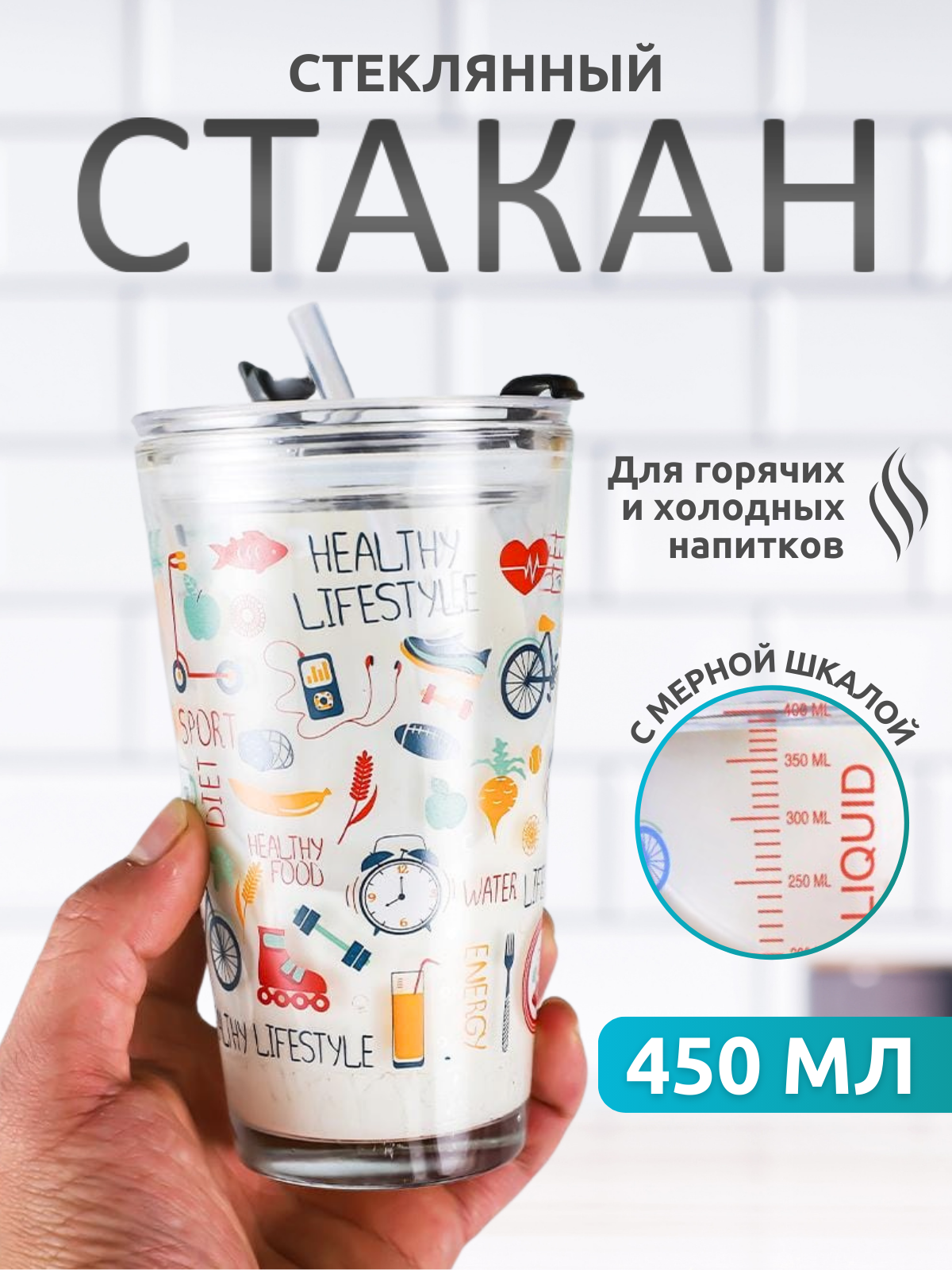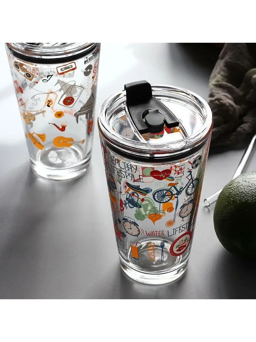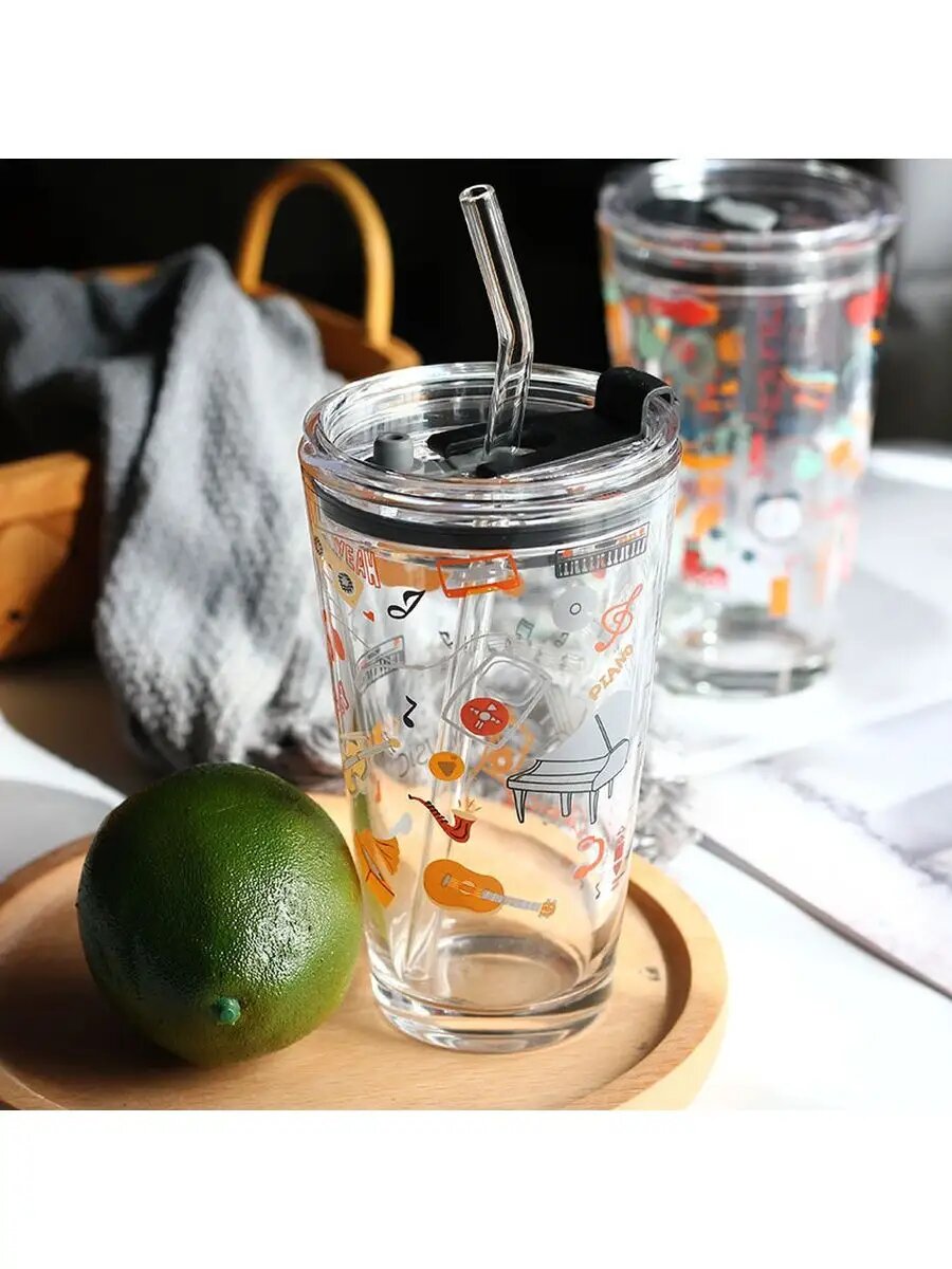 Стеклянный стакан с крышкой трубочкой 450 мл Стакан с рисунком