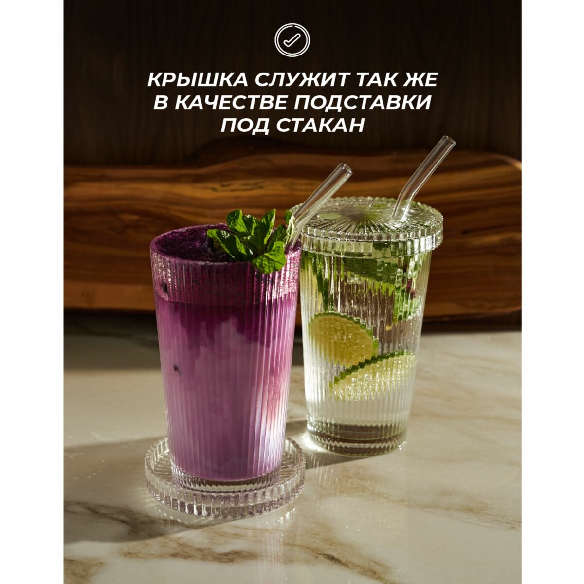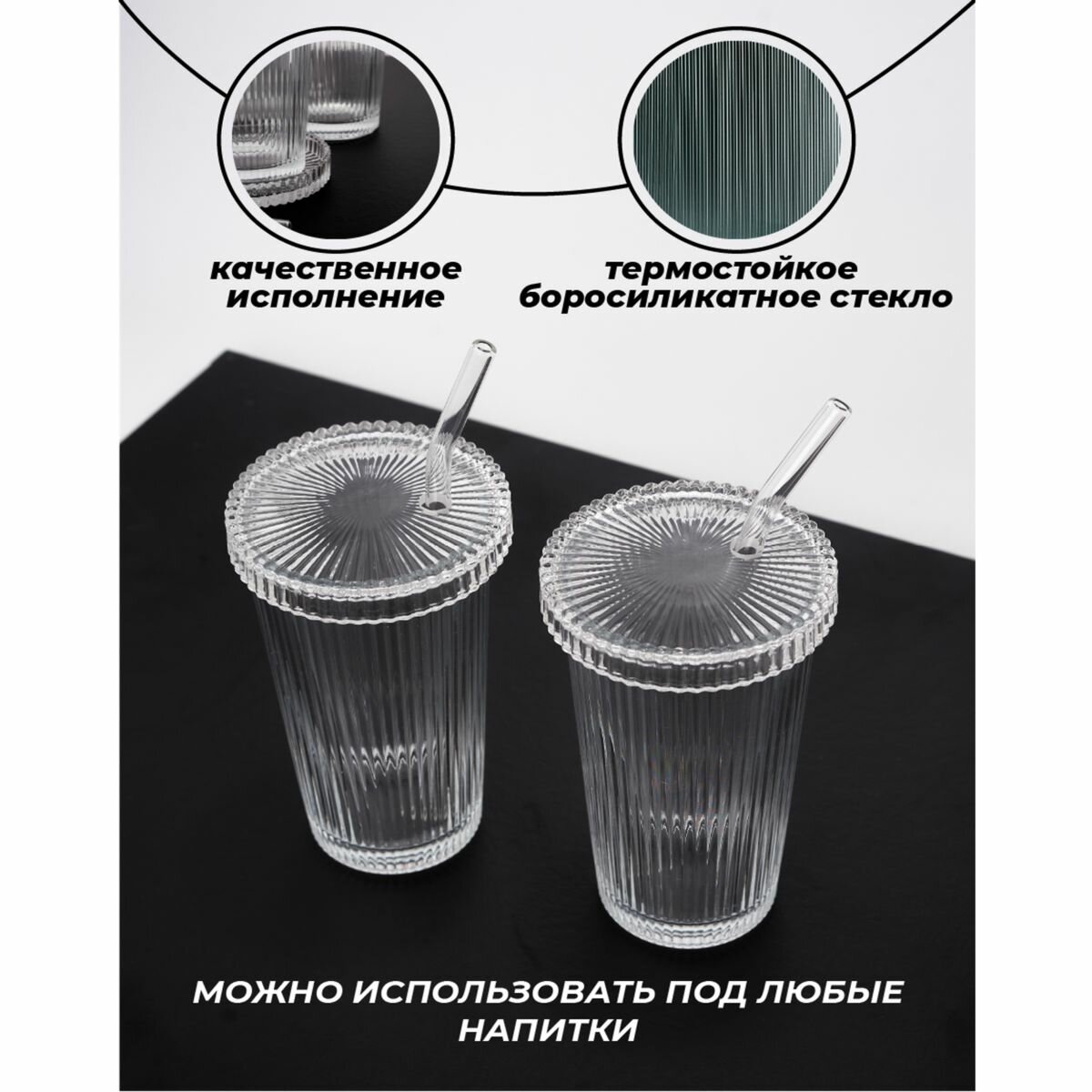 Набор стеклянных рифленых стаканов 4 шт с трубочкой и крышкой для воды кофе лимонадов коктейлей