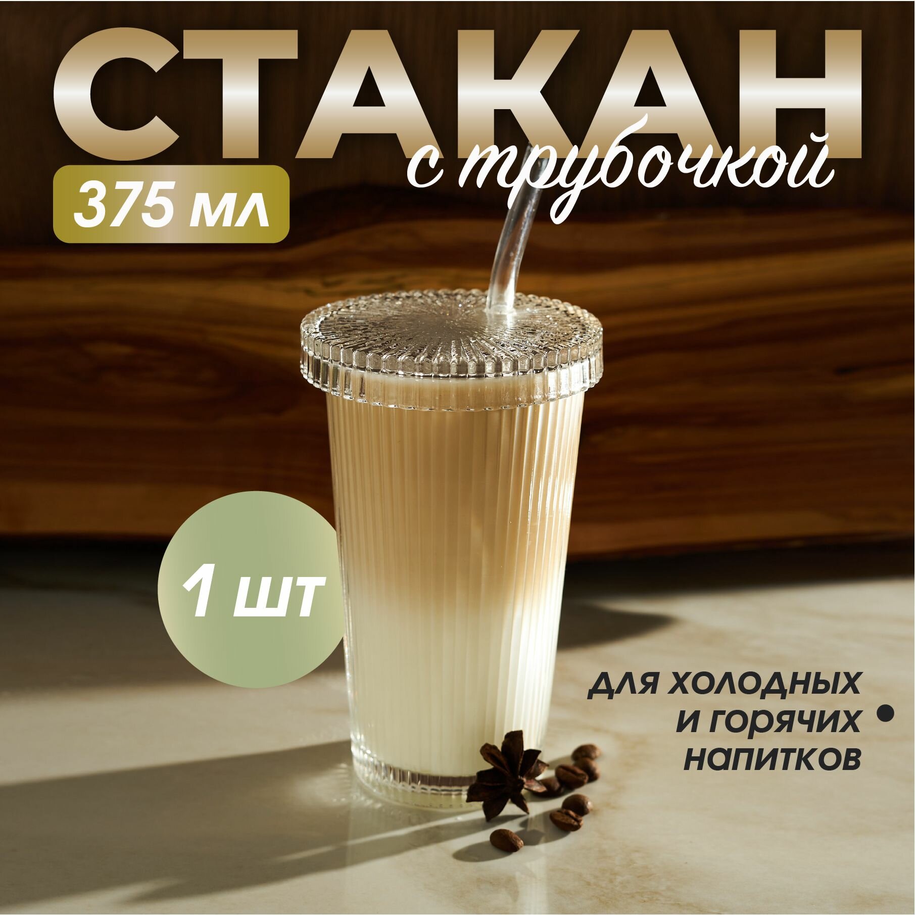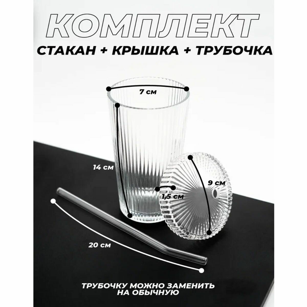 Стакан с трубочкой и крышкой, рифленый, стеклянный для кофе, воды, чая, напитков, коктейлей, лимонадов подарок интересное: