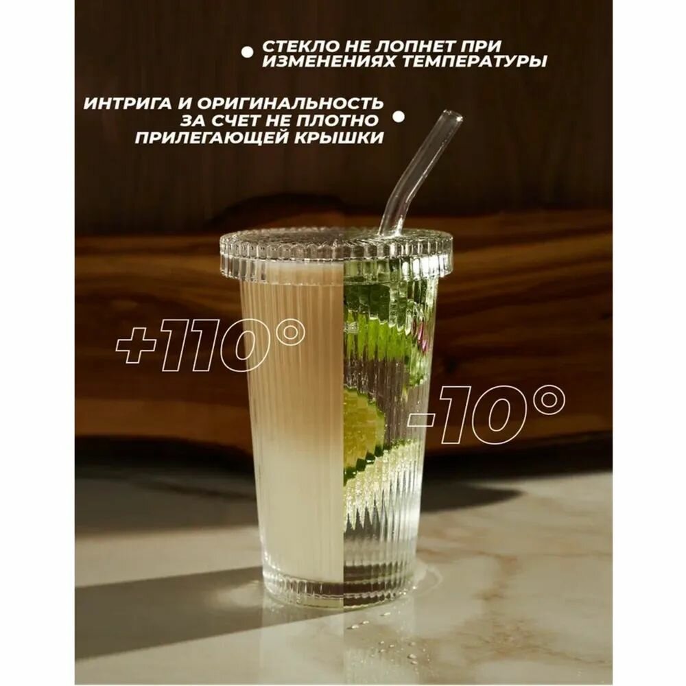 Купить Стакан с трубочкой и крышкой, рифленый, стеклянный для кофе, воды, чая, напитков, коктейлей, лимонадов подарок