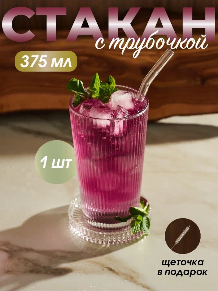 Стакан с трубочкой и крышкой, рифленый, стеклянный для напитков, в подарок с щеточкой интересное: