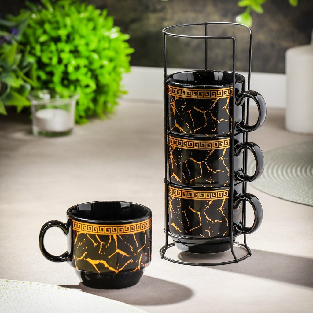 Купить Кружка керамика, 4 шт, 160 мл, Греческий узор, Y4-5346, черная, металлическая подставка
