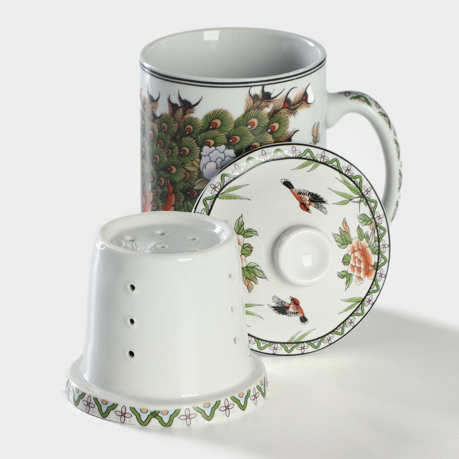 Кружка керамическая с крышкой и ситом «Цветение роз», 360 мл, цвет белый