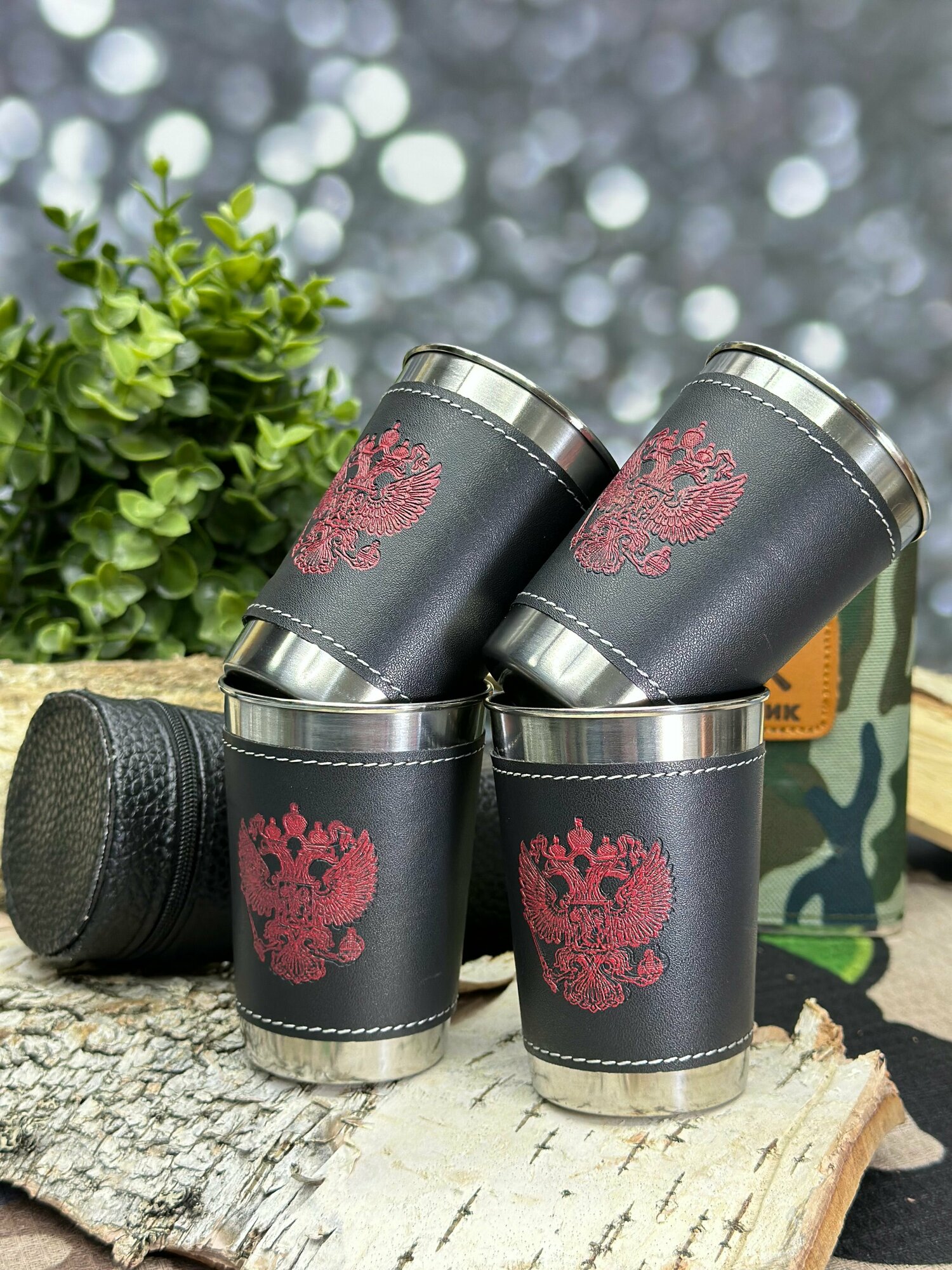 Походный, сувенирный набор стопок/рюмок с тиснением "Герб России" с бортиком 70мл 4шт в чехле интересное: