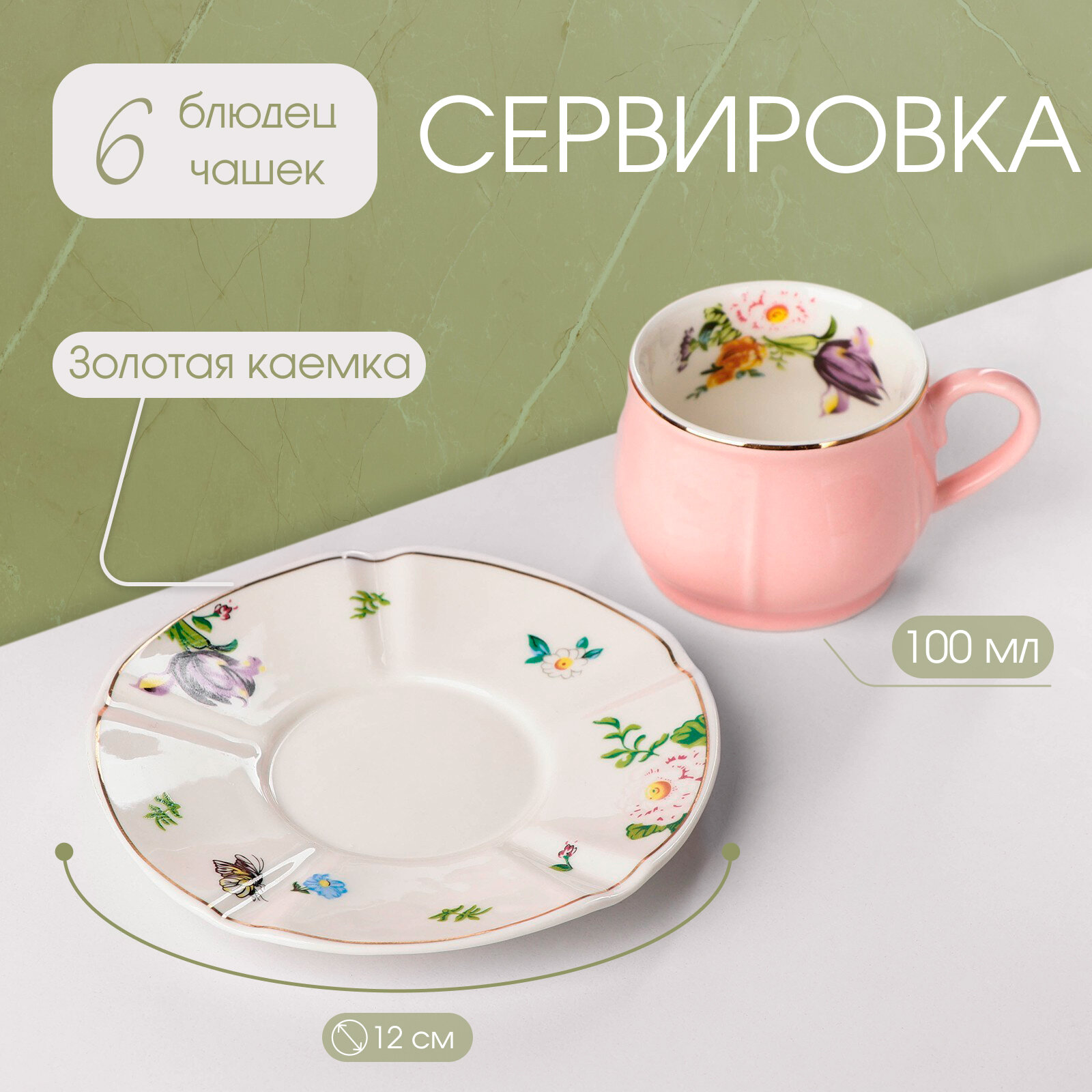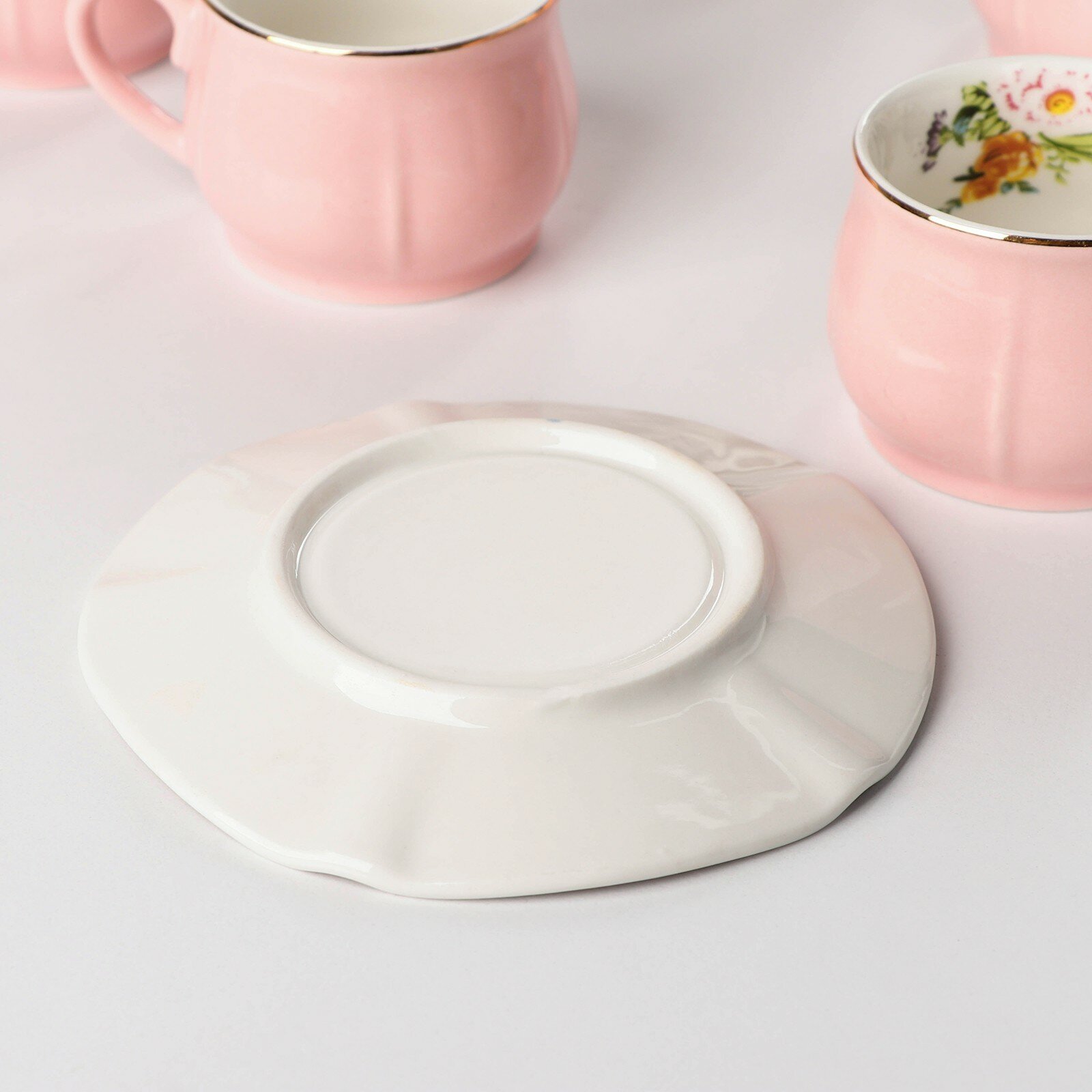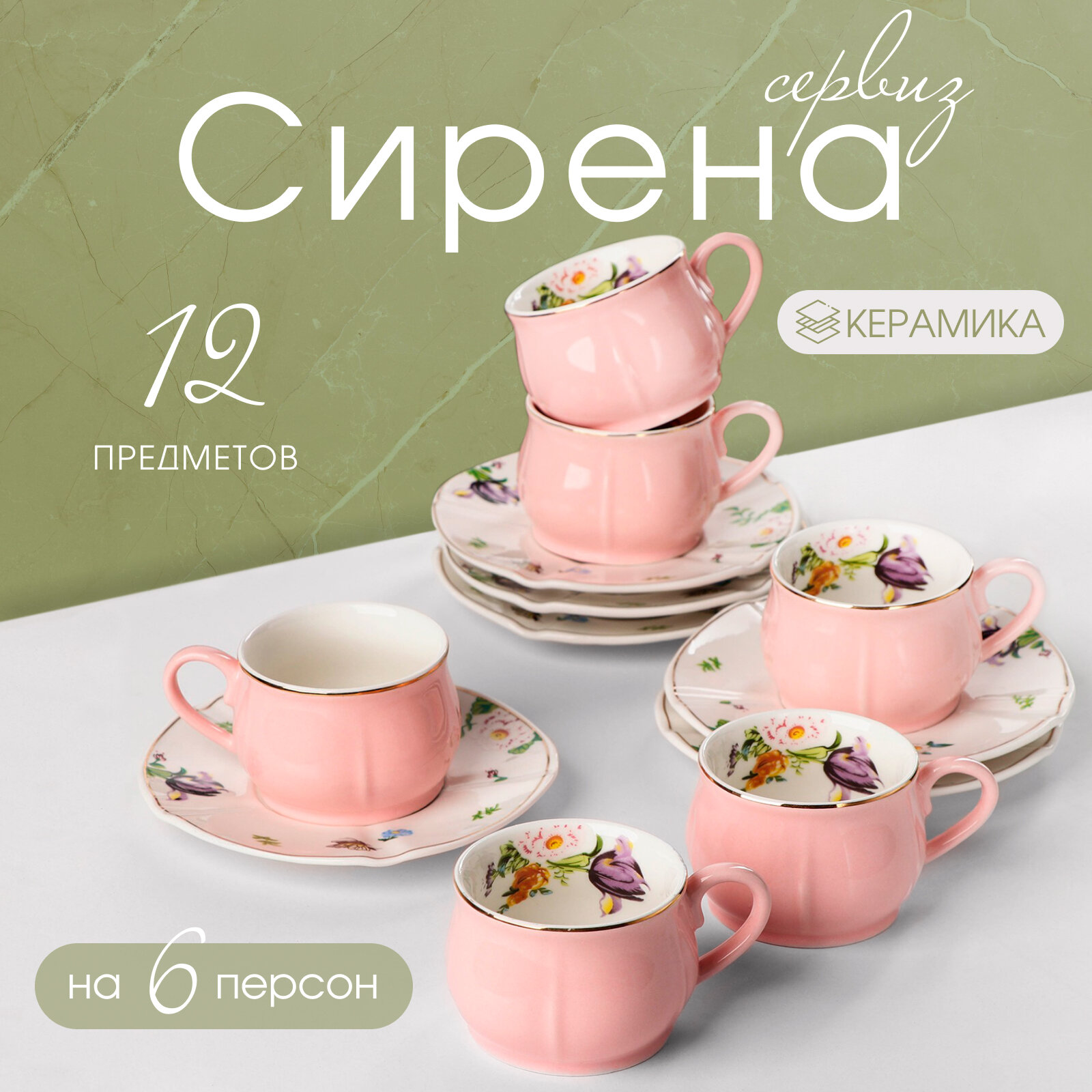 Сервиз керамический кофейный "Сирена", 12 предметов: 6 чашек 100 мл, 6 блюдец 12 см, цвет розовый