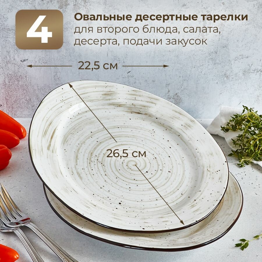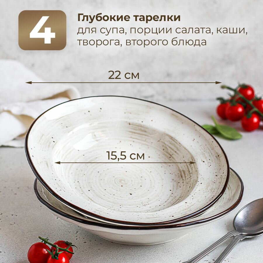 | Комплектация | 4 глубоких тарелки 350 мл, диаметр 22 см; 4 плоских тарелки диаметр 22,5 см; 1 большой салатник 1,2 л и 1 маленький салатник 750 мл |