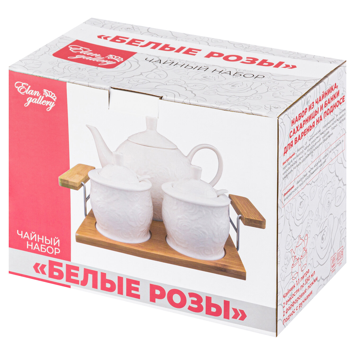 Купить Набор 30х25х17 см Elan Gallery Белые розы - чайник, сахарница, банка для варенья, с двумя ложками на деревянном подносе