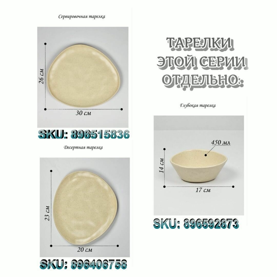 | Комплектация | сервировочные тарелки 6шт., десертные тарелки 6шт., глубокие (суповые) тарелки 6шт. |