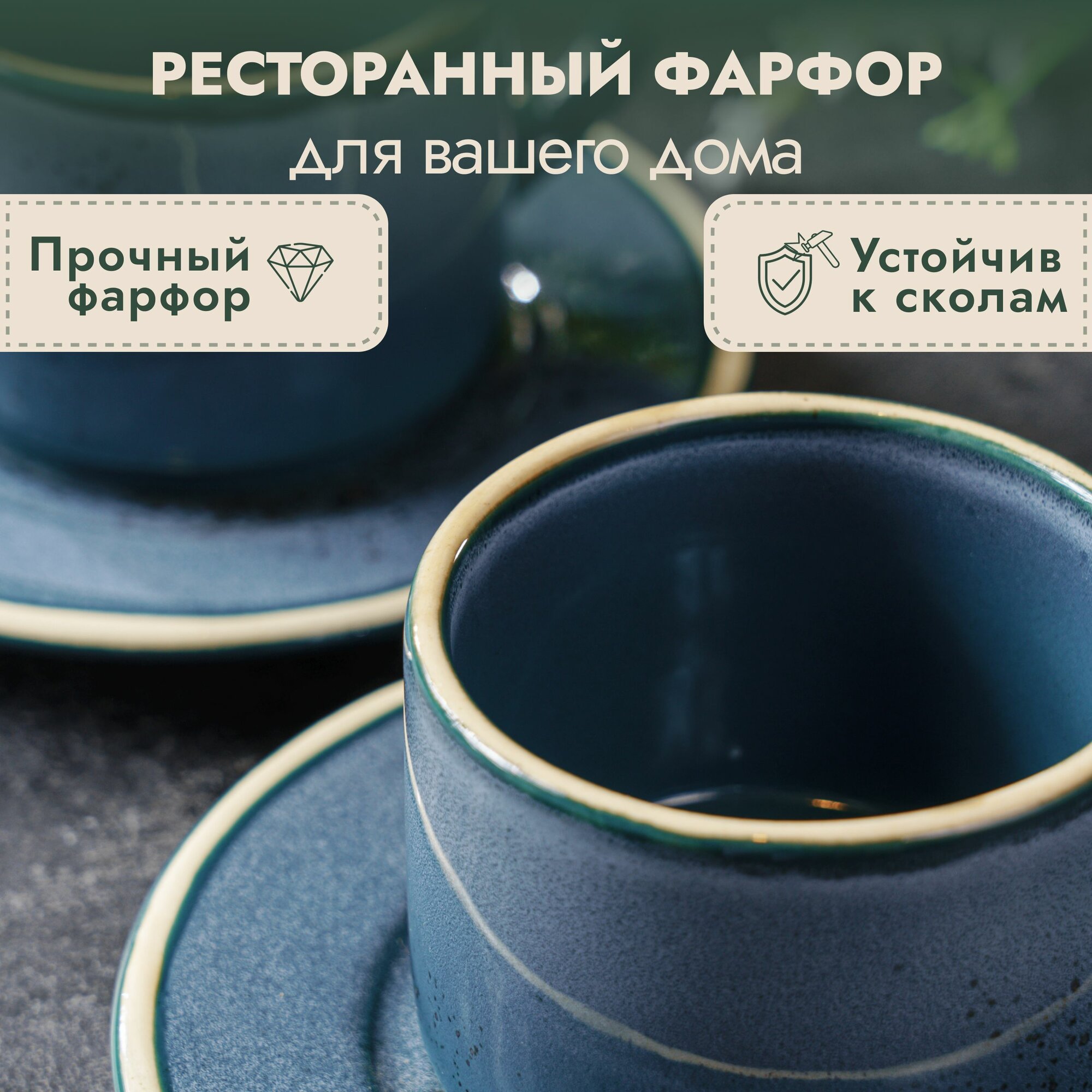 Набор кофейных пар на 2 персоны, чашки для чая, кофе и горячего шоколада, фарфор, зеленый с бежевым краем, 200 мл.
