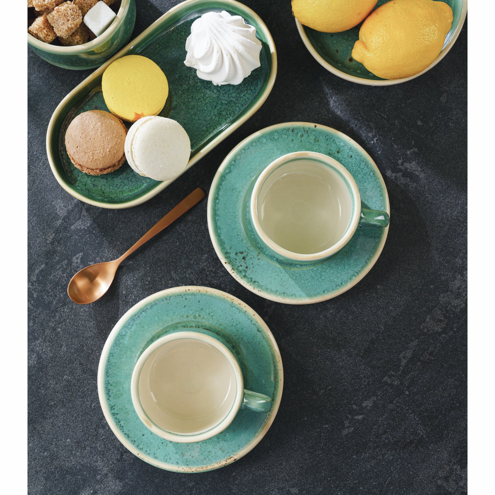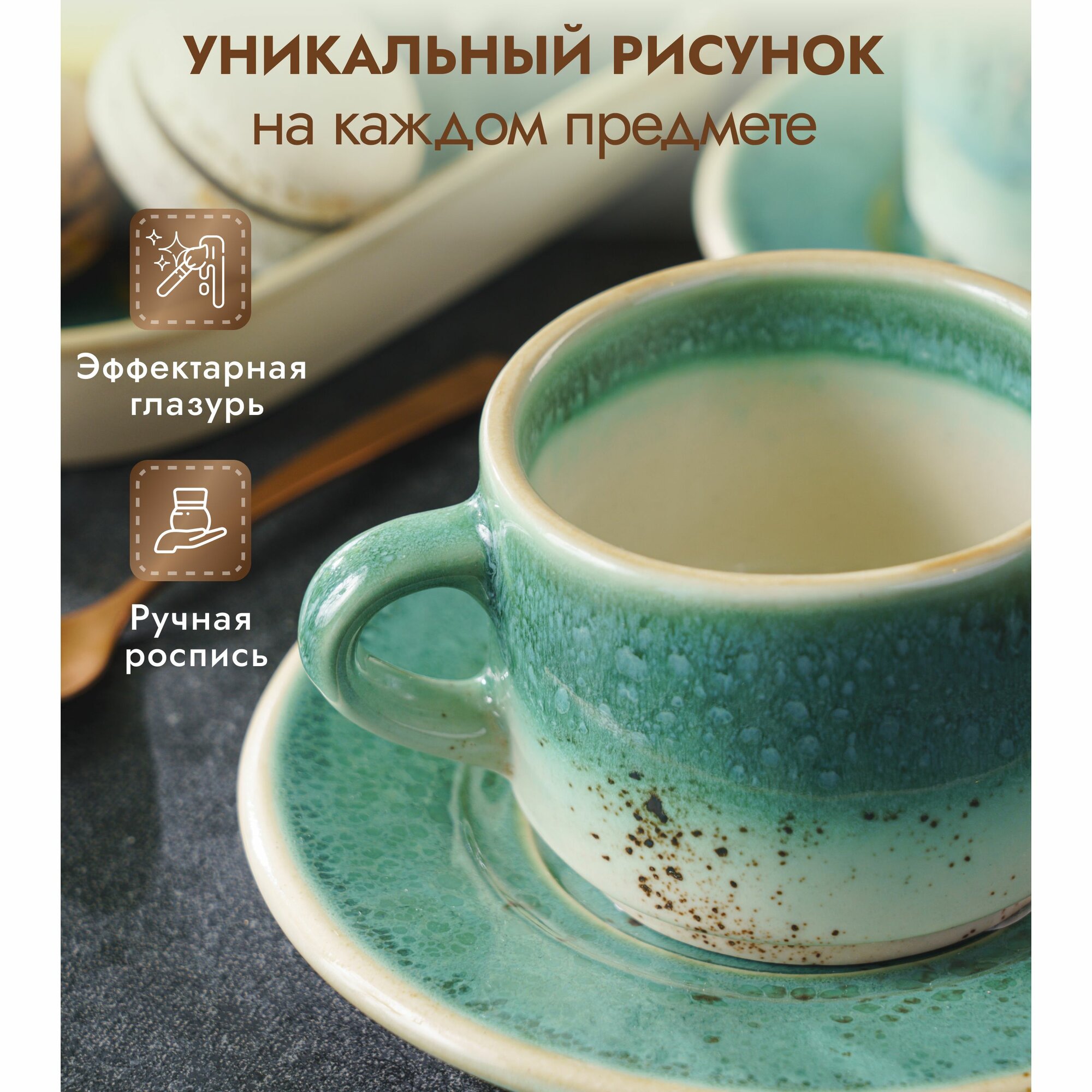 Набор кофейных пар на 2 персоны, чашки для чая, кофе и горячего шоколада, фарфор, зеленый с бежевым краем, 200 мл. интересное: