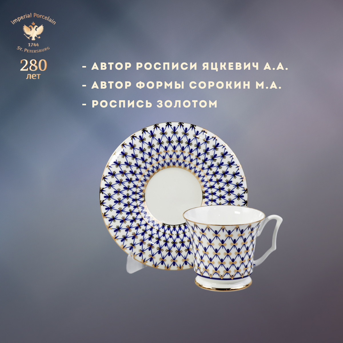 СохранитьКофейная пара, чашка с блюдцем, 145 мл. Форма "Юлия", рисунок "Кобальтовая сетка". Костяной фарфор. Императорский фарфоровый завод ИФЗ ЛФЗ. интересное: