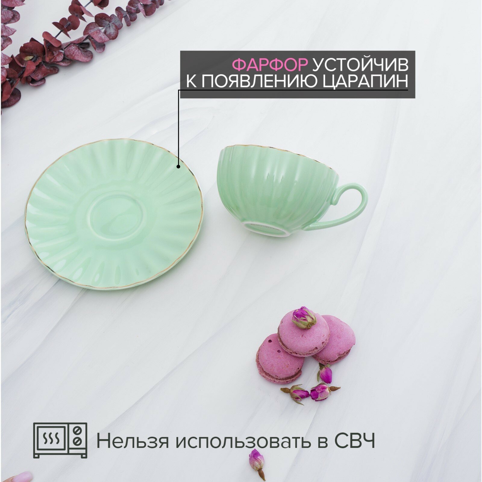 Купить Чайная пара Доляна фарфоровая "Вивьен " чашка 200 мл, блюдце 15 см, зеленый