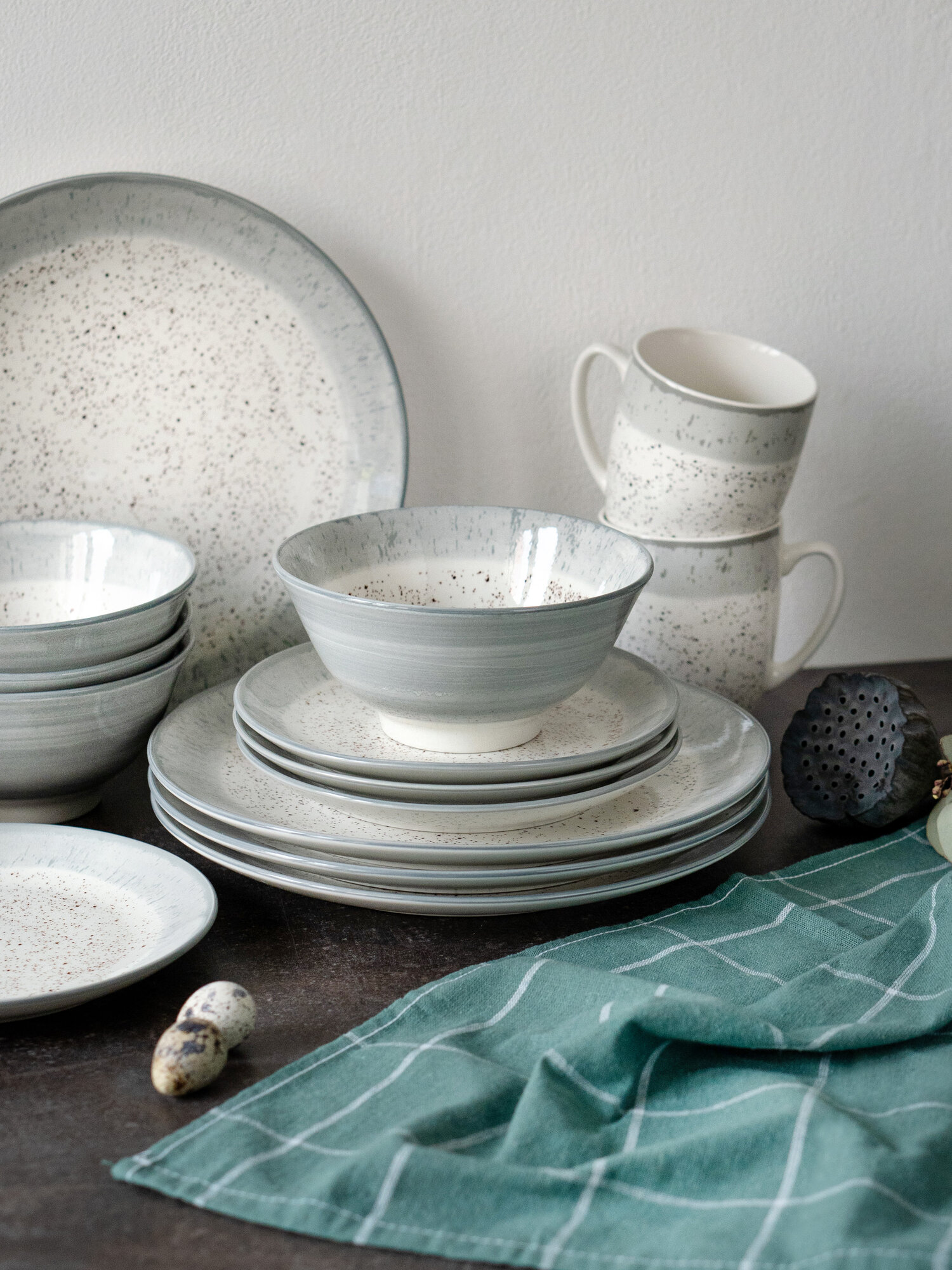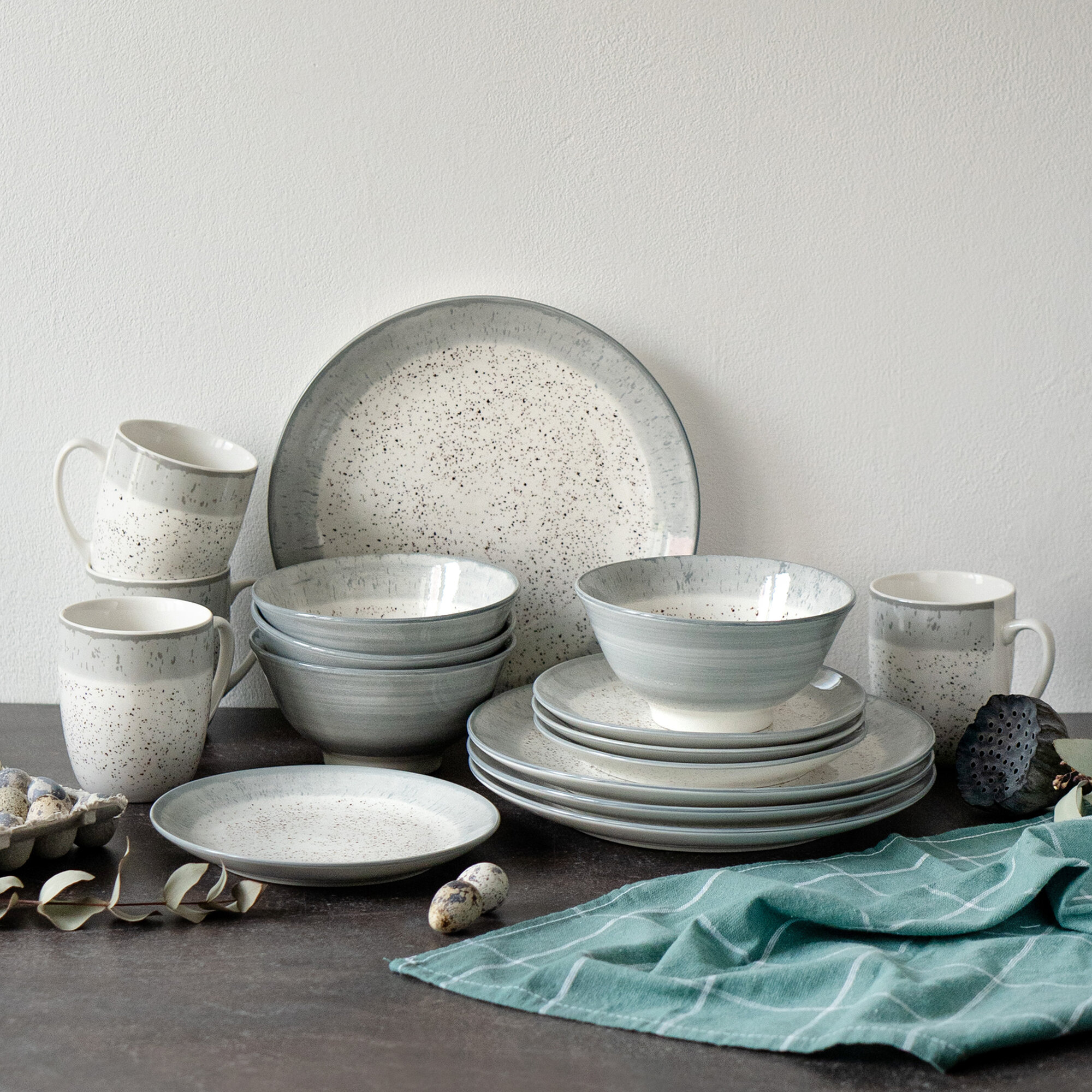 Набор посуды столовой на 4 персоны 16 предметов фарфор Rustic grey. Столовый сервиз обеденный набор тарелок c кружками интересное: