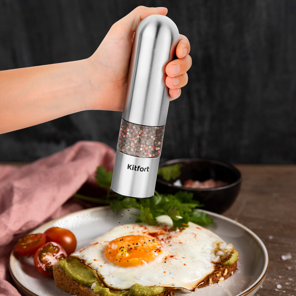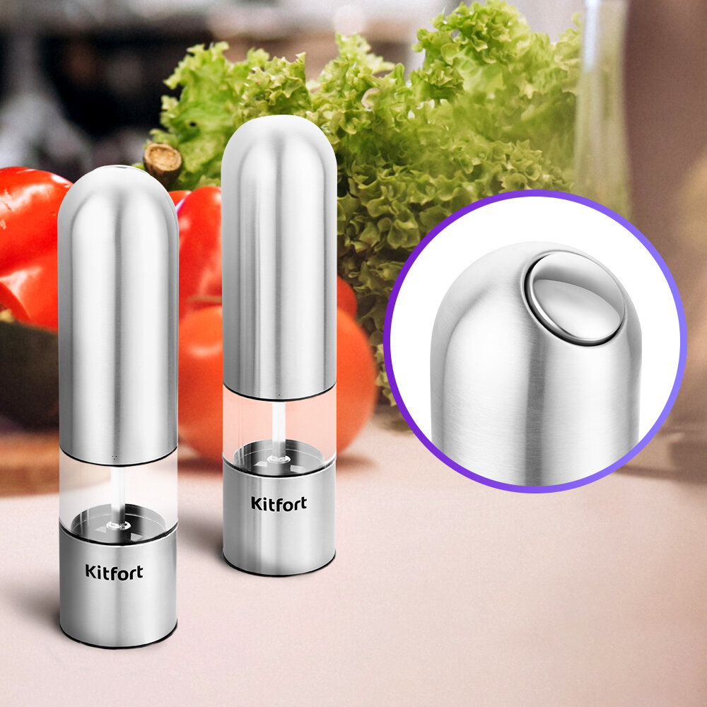 Набор автоматических мельниц для соли и перца Kitfort KT-2028, регулировка степени помола, в комплекте 2 мельницы, цвет серебристый