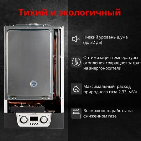 | Дополнительная информация | Интуитивная панель управления, Качественная и надежная сборка, Латунная гидрогруппа, Возможность подключения устройств для дистанционного управления посредством шины OpenTherm, Медные патрубки, Оптимизация температуры отопления сокращает затраты на энергоносители, Низкий уровень шума (до 32 Децибел) |