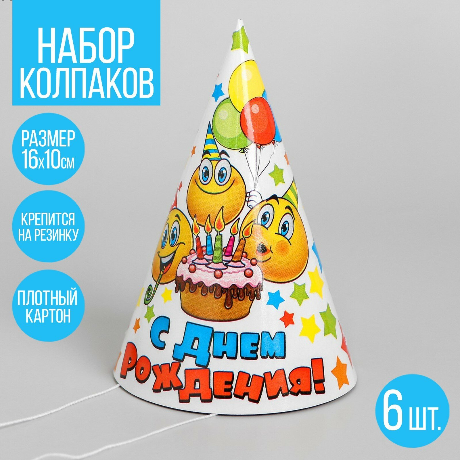 Колпак праздничный бумажный "С Днем Рождения", смайлы и звезды, набор из 6 штук, размер: 16 см., для детей и малышей интересное: