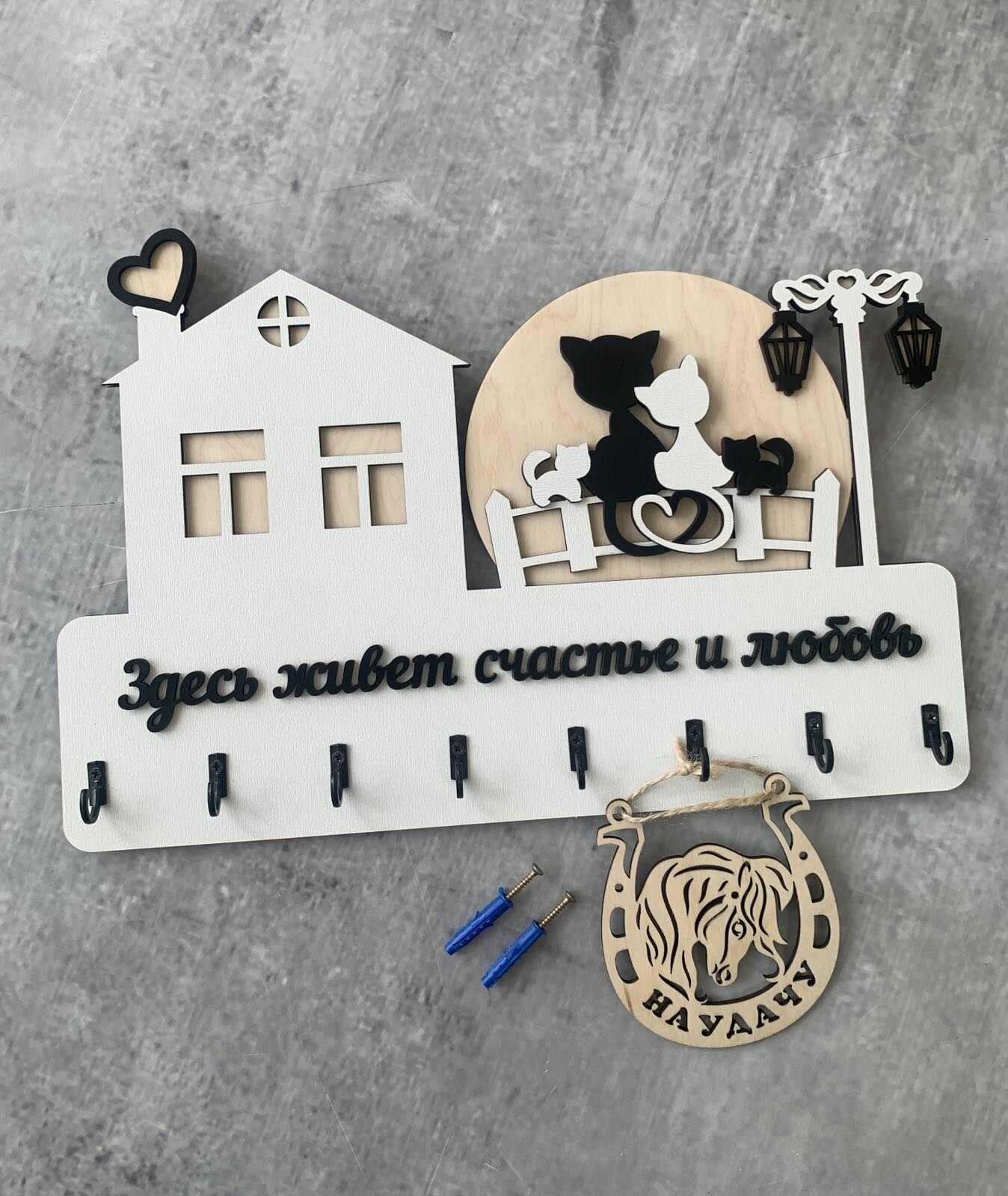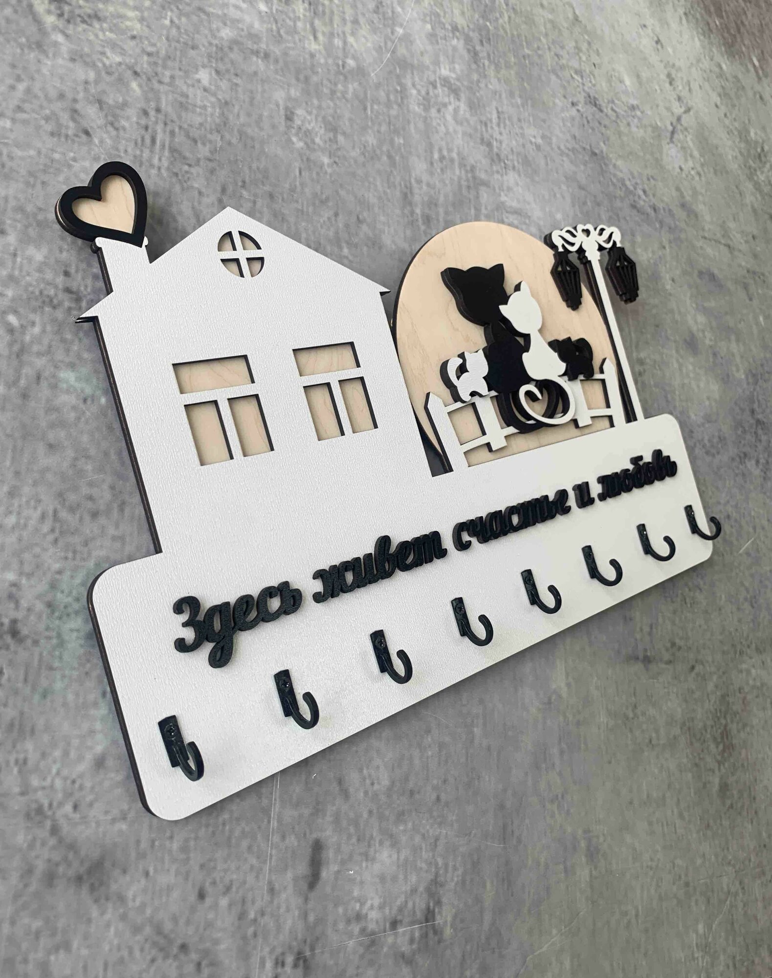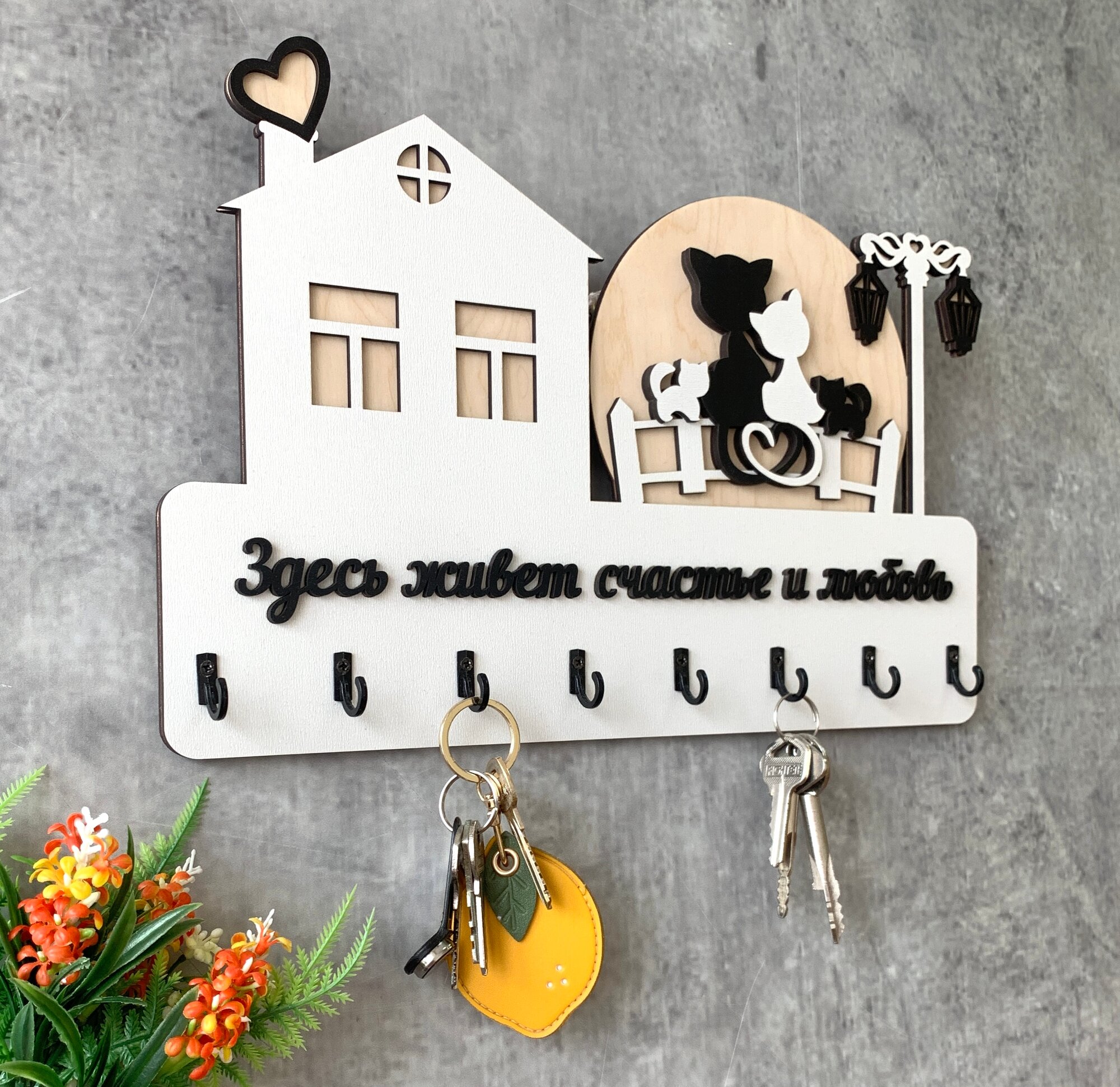 Ключница настенная именная с фамилией "Дом Семьи Шуваловых" в дом с котом и собакой в прихожую в подарок на нвооселье