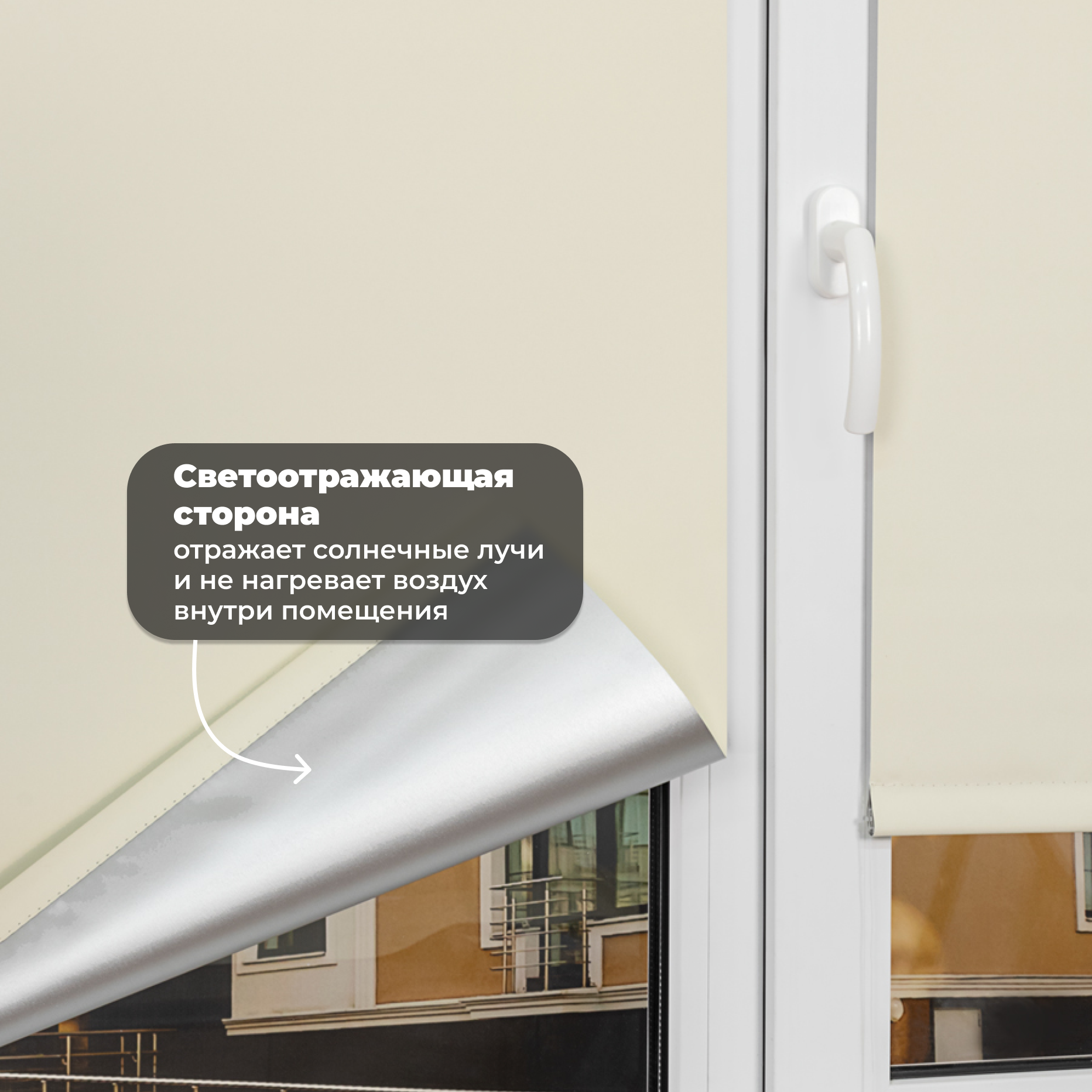 | Дополнительная информация | На обратной стороне ткани светоотражающий слой серебристого цвета. Несколько вариантов установки: без сверления на пластиковое глухое окно или с поворотно-откидным механизмом; со сверлением - на любое окно, на неподвижную раму, на стену (оконный проем), на раму, к потолку, в проем. |