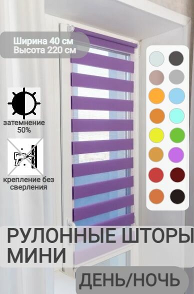 Купить Рулонные шторы день ночь ширина 40, высота 220 см, сиреневые жалюзи на окна Зебра для кухни, спальни, детской, на балкон