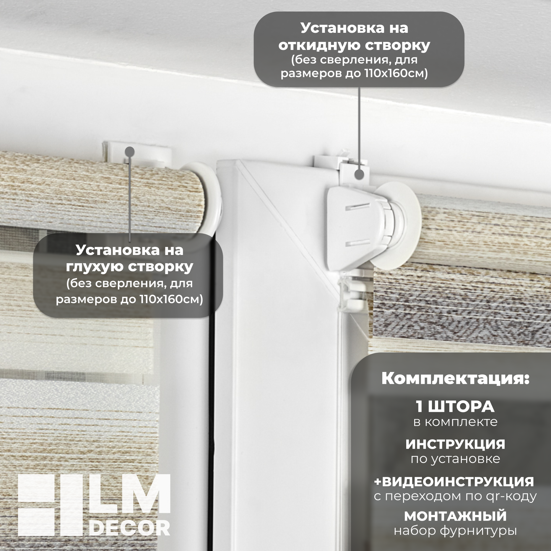 | Дополнительная информация | Несколько вариантов установки: без сверления на пластиковое глухое окно или с поворотно-откидным механизмом; со сверлением - на любое окно, на неподвижную раму, на стену (оконный проем), на раму, к потолку, в проем. |