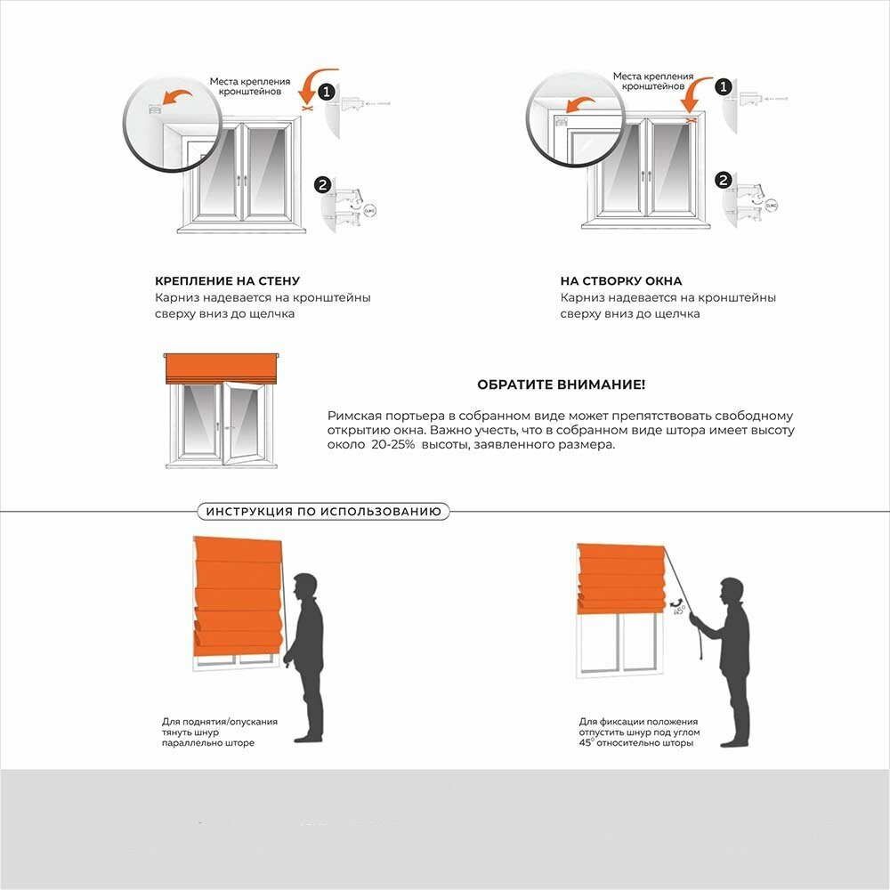 | Комплектация | Римская штора - 1 шт, Карниз- 1 шт, кронштейн на стену/потолок - 2 шт, саморез/дюбель -2шт, Инструкция |