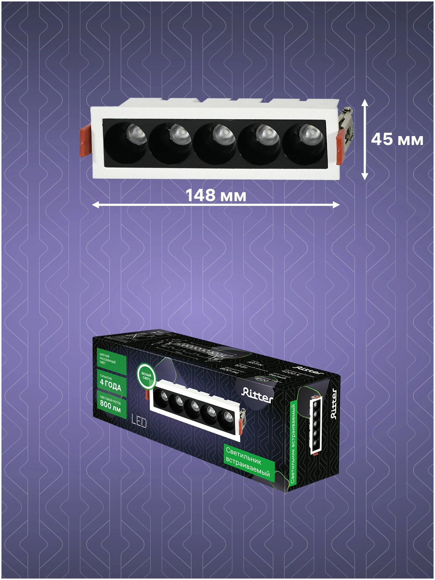 Светильник встраиваемый светодиодный Artin LED 10Вт, 800Лм, 4200К, 148х45х55мм, алюминий, прямоугольный, белый, светильник потолочный, Ritter, 59996 8 интересное: