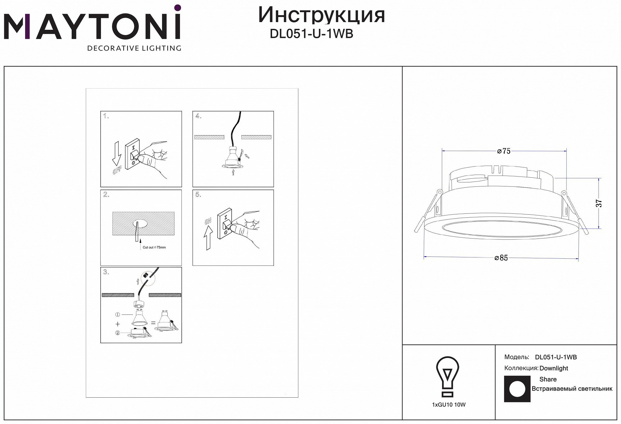 Встраиваемый светильник Maytoni Share DL051-U-1B, GU10, кол-во ламп:1шт, Черный