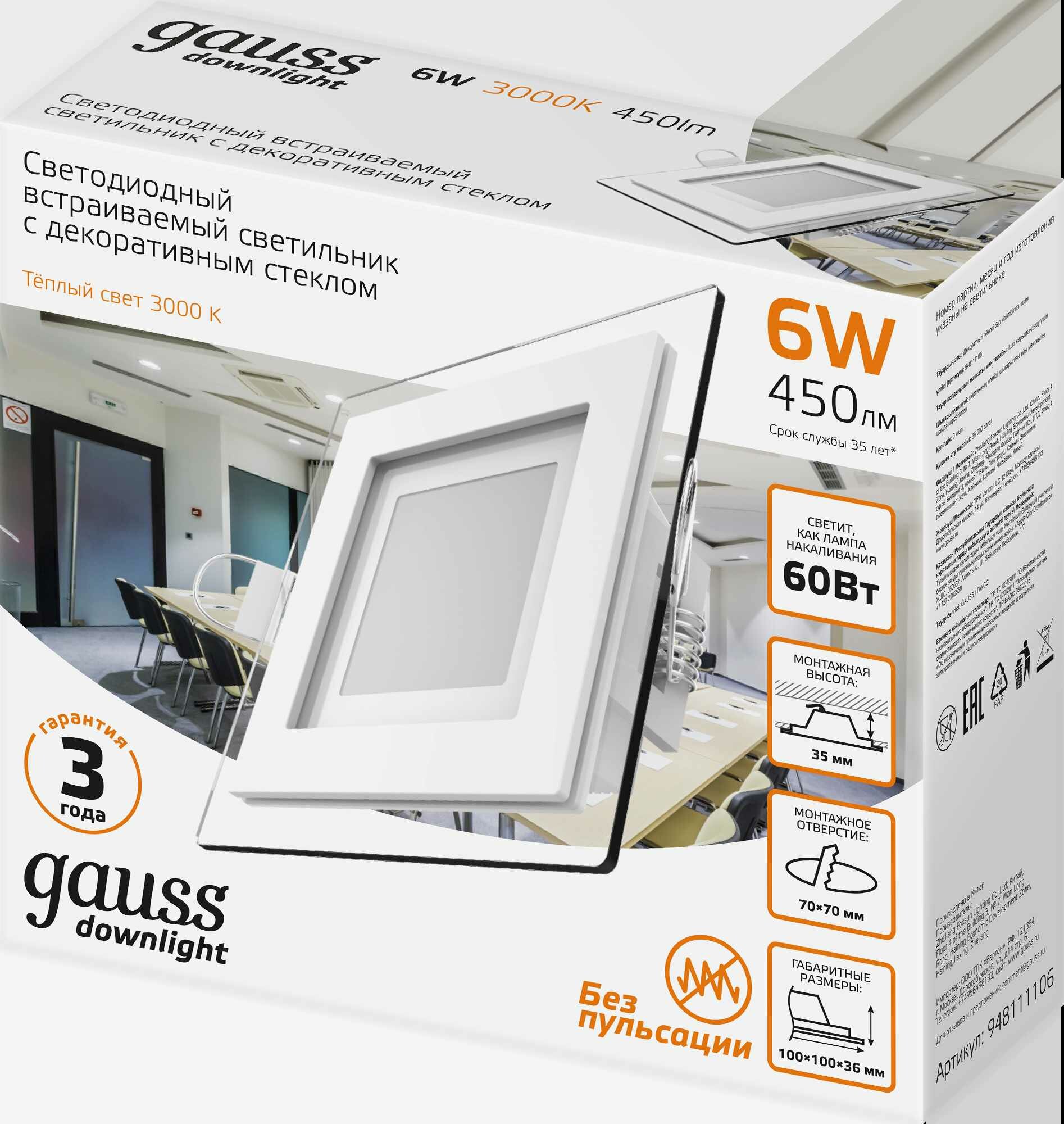 Встраиваемый светильник Gauss , квадратный с декоративным стеклом, 6W 3000K 1/40