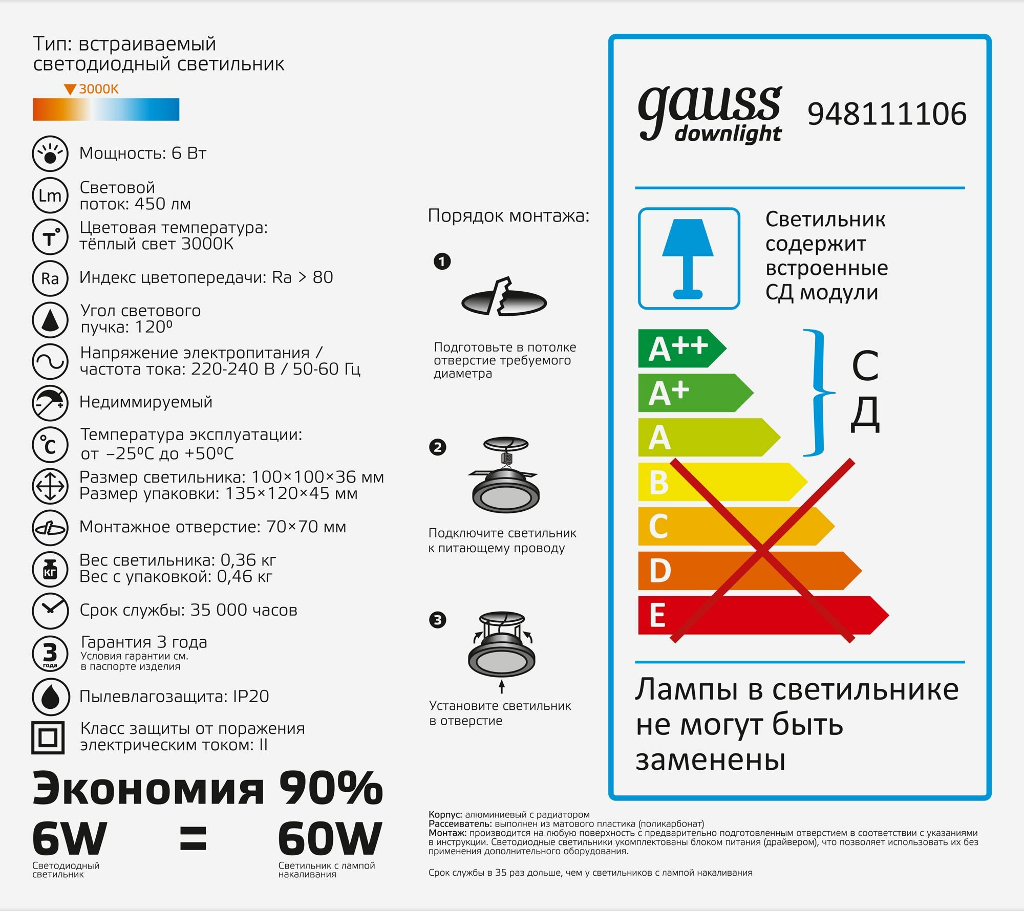 Светильник Gauss 948111118 18Вт 3000K цв.св.:белый теплый белый