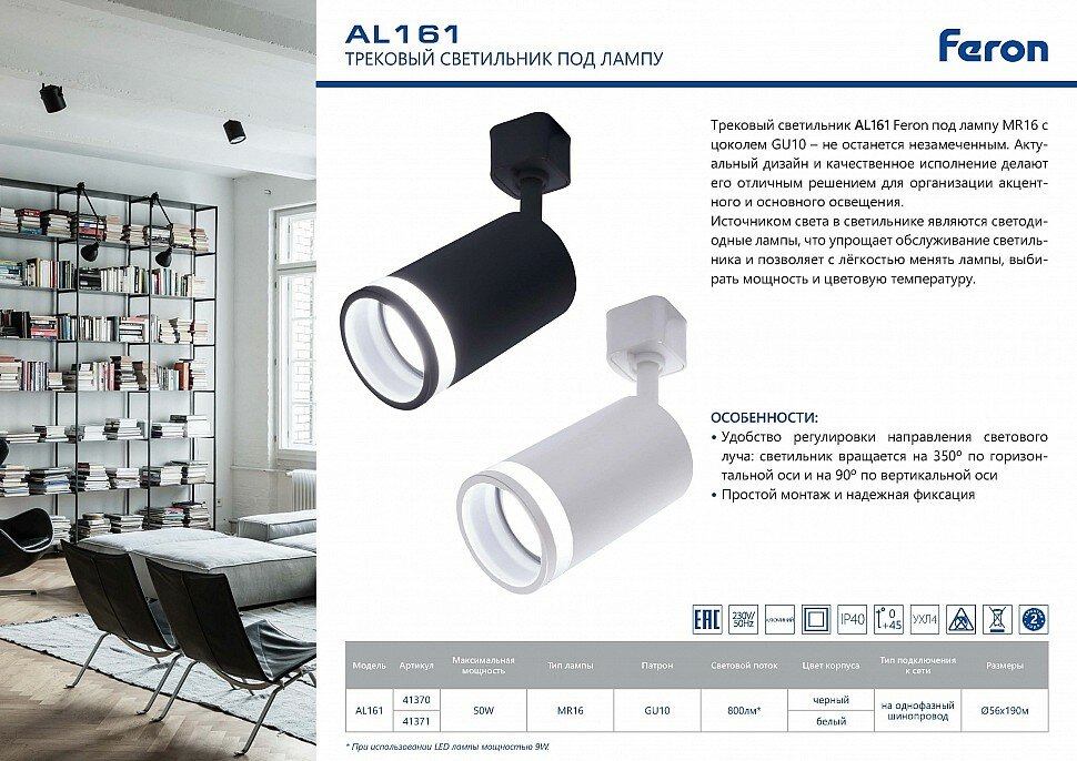 СохранитьСветильник Feron AL161 трековый однофазный на шинопровод под лампу GU10, IP40 черный (без лампы) интересное: