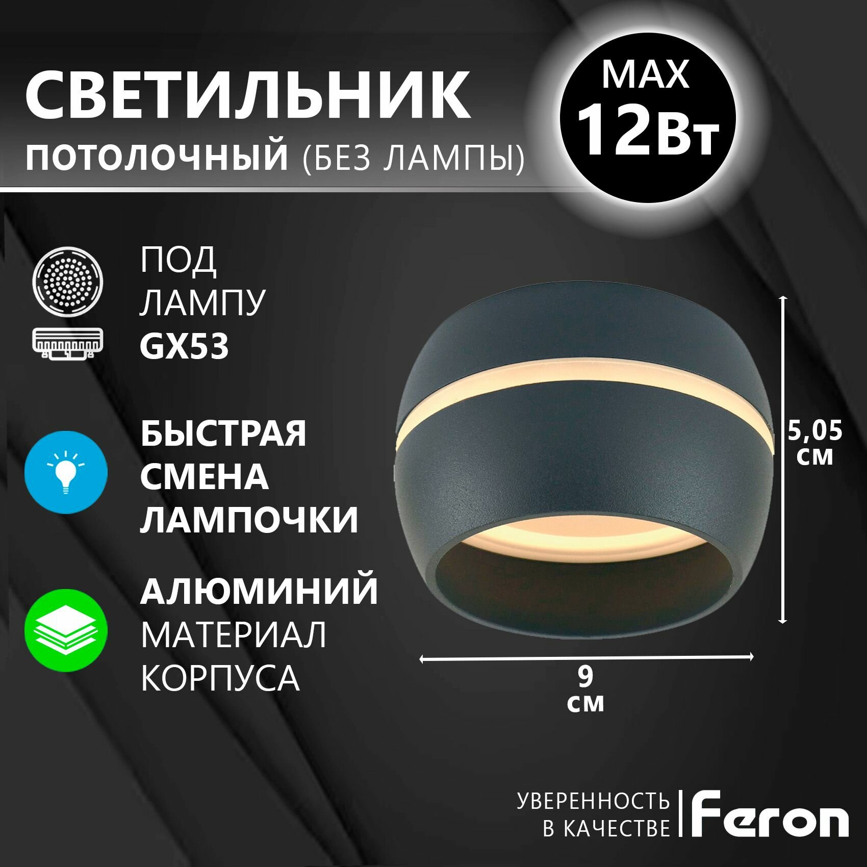 Светильник потолочный 12W, 230V, GX53, черный, HL362, Feron, 41997