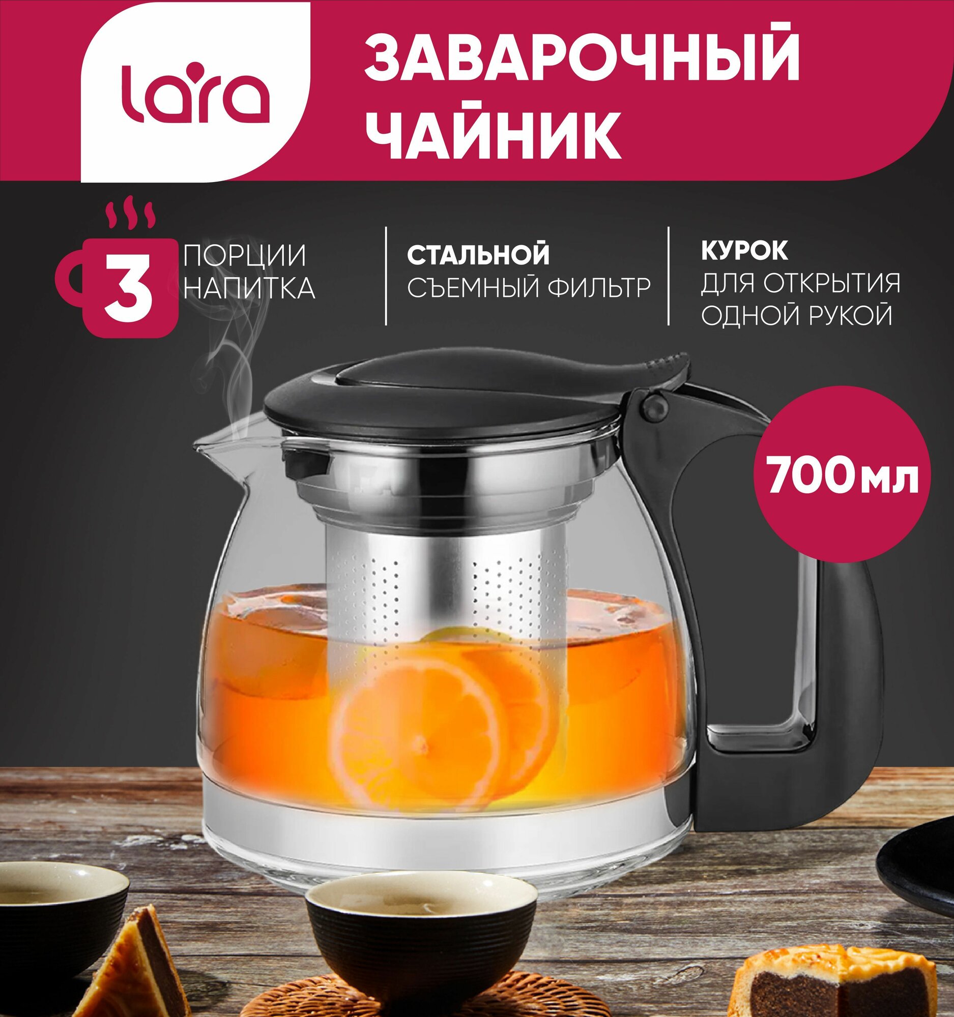 Купить Чайник заварочный стеклянный LARA LR06-19 Black/ 0.7 л/ стальной фильтр/ подъем крышки