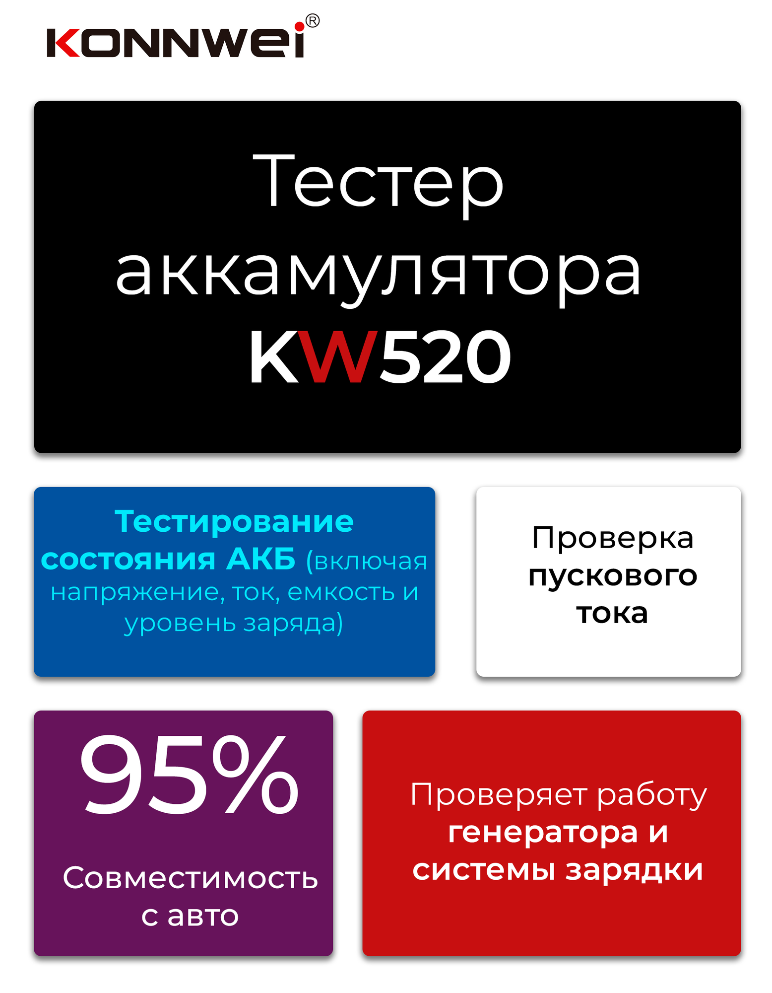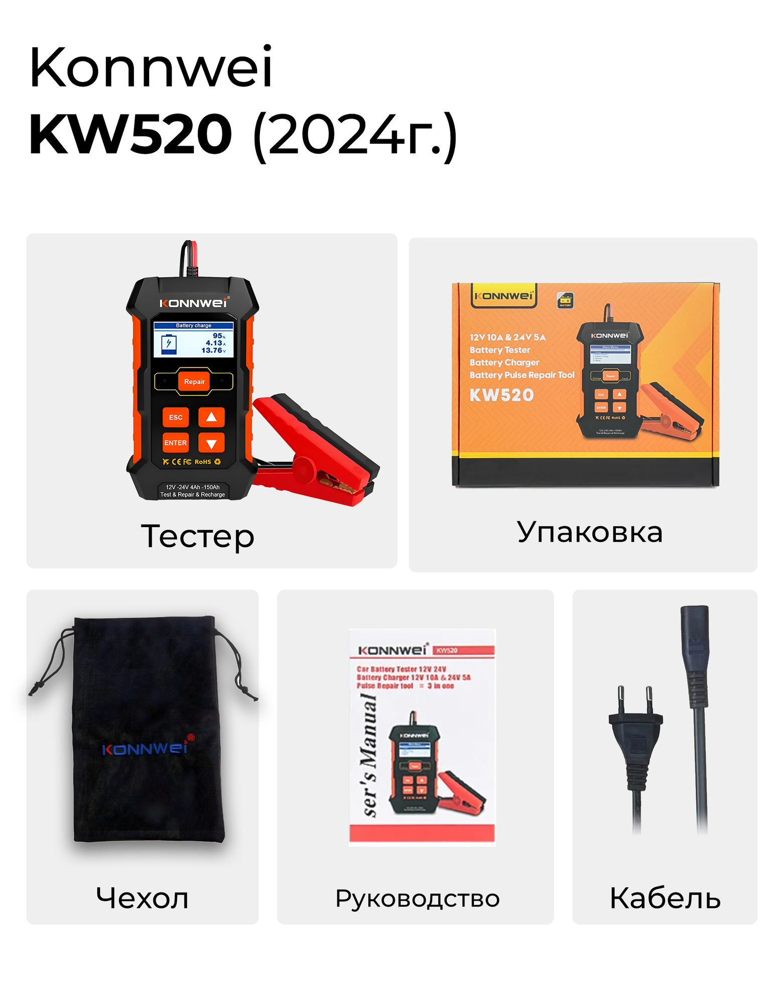 Тестер аккумуляторных батарей АКБ Konnwei KW520 для всех автомобилей 12V 10A 24V 5A интересное: