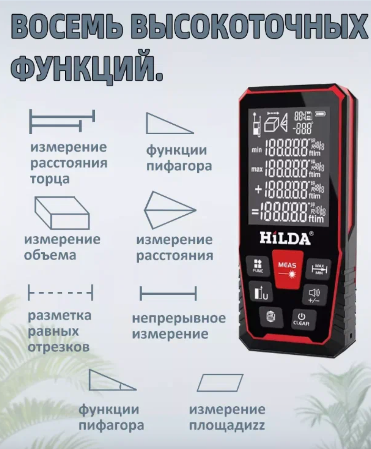 | Функции и особенности | автоматическое отключение, встроенная память, ударопрочный корпус, функция Пифагора, функция непрерывного измерения, функция расчета объема, функция расчета площади, функция сложения/вычитания |