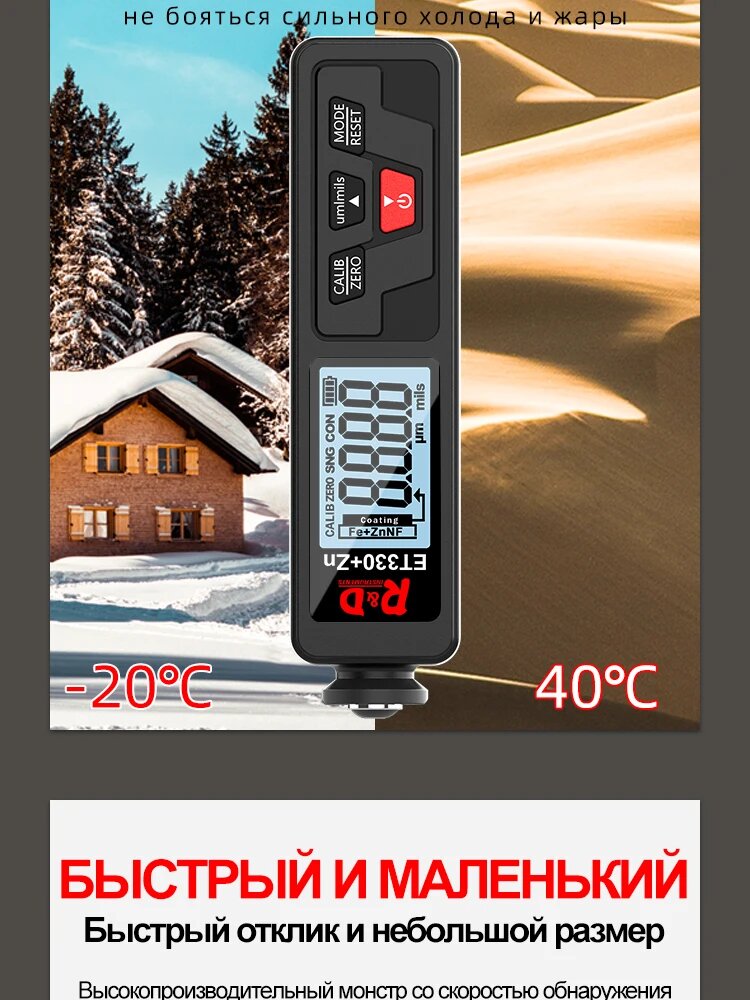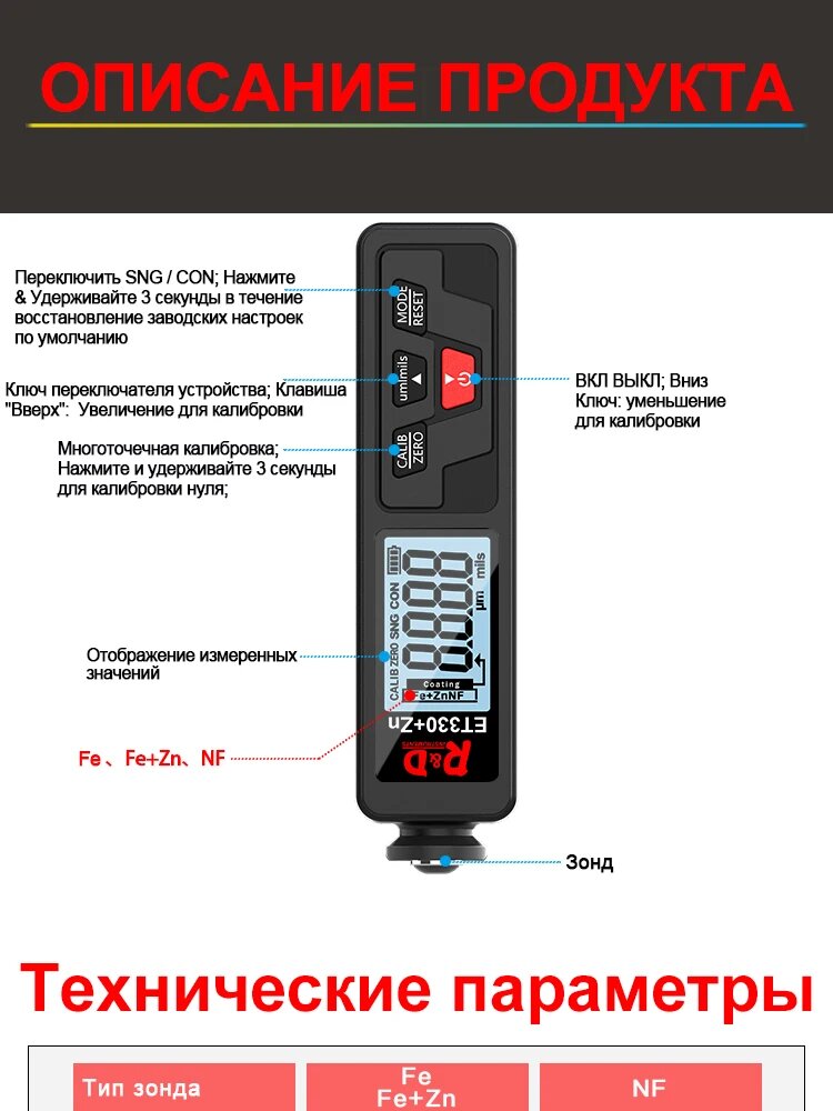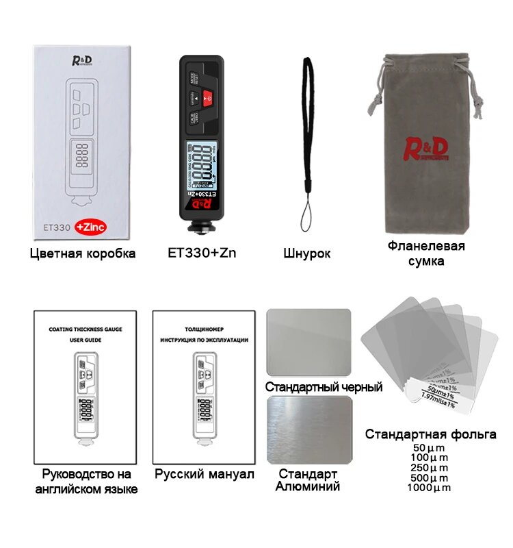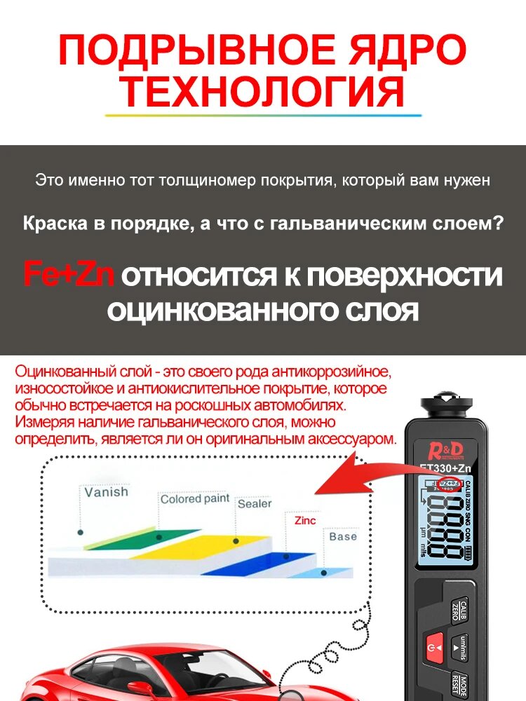 R & D ET330 + ZN Толщиномер автомобильной краски Портативный измеритель толщины покрытия для автомобиля 0-1500um Fe и NFe Тестер покрытия интересное:
