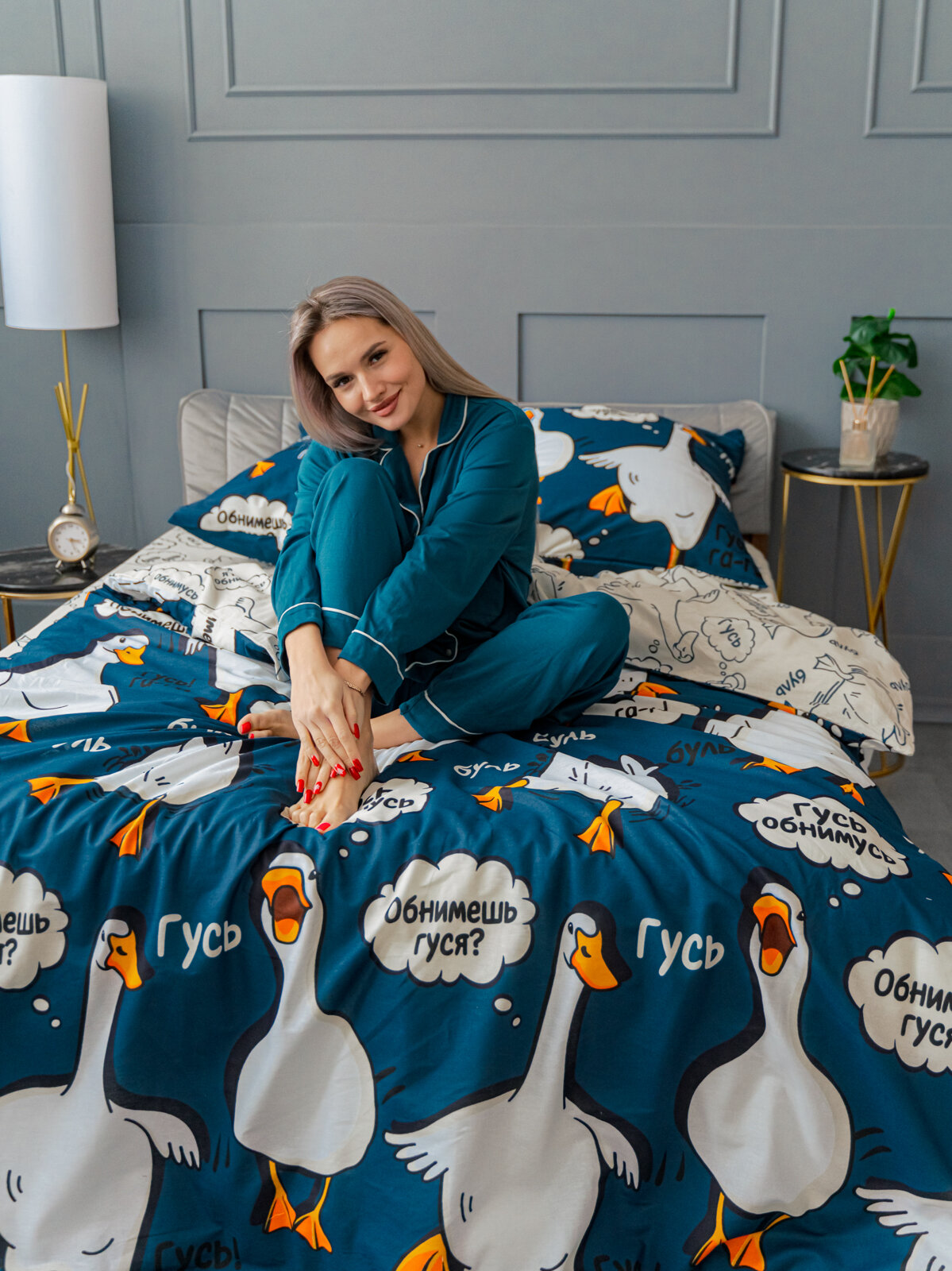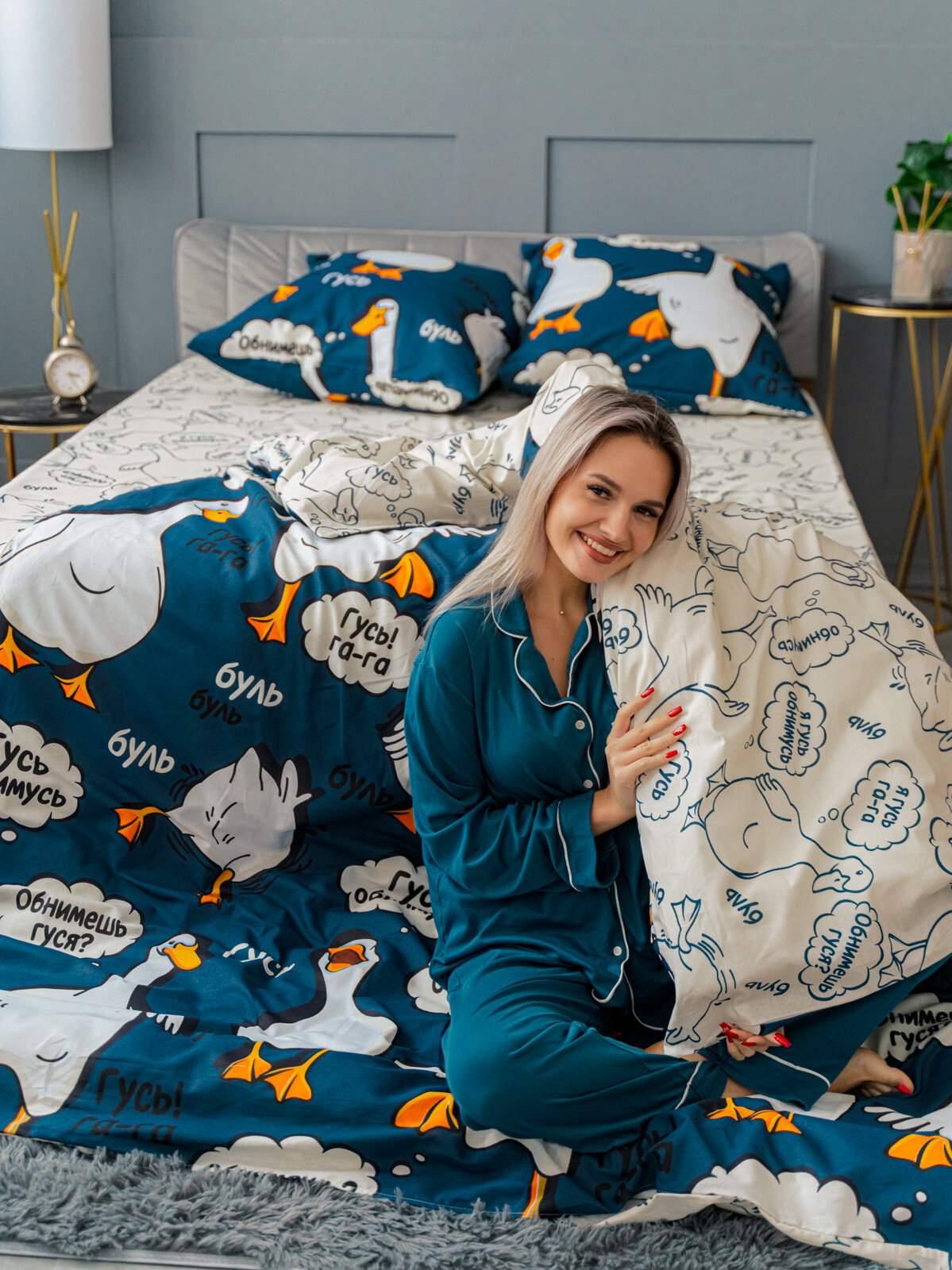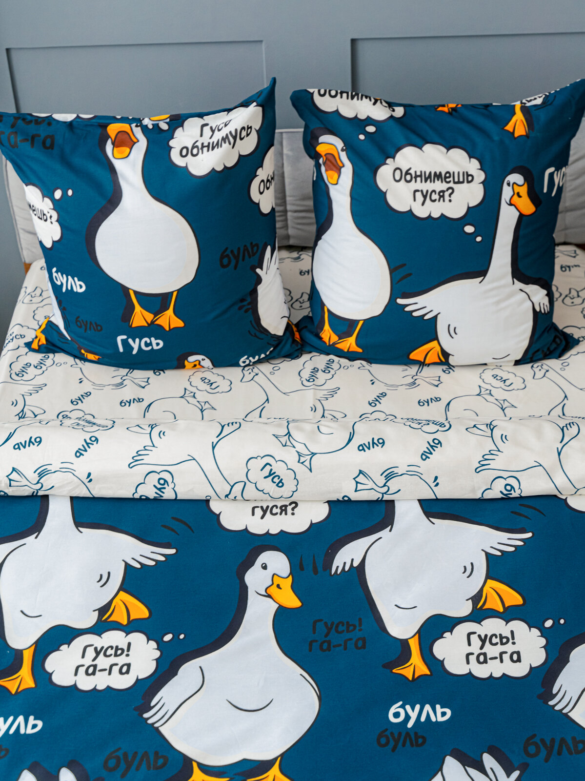 Постельное белье 2 спальное Павлинка "Гусь-обнимусь" синий, бязь 100% хлопок интересное: