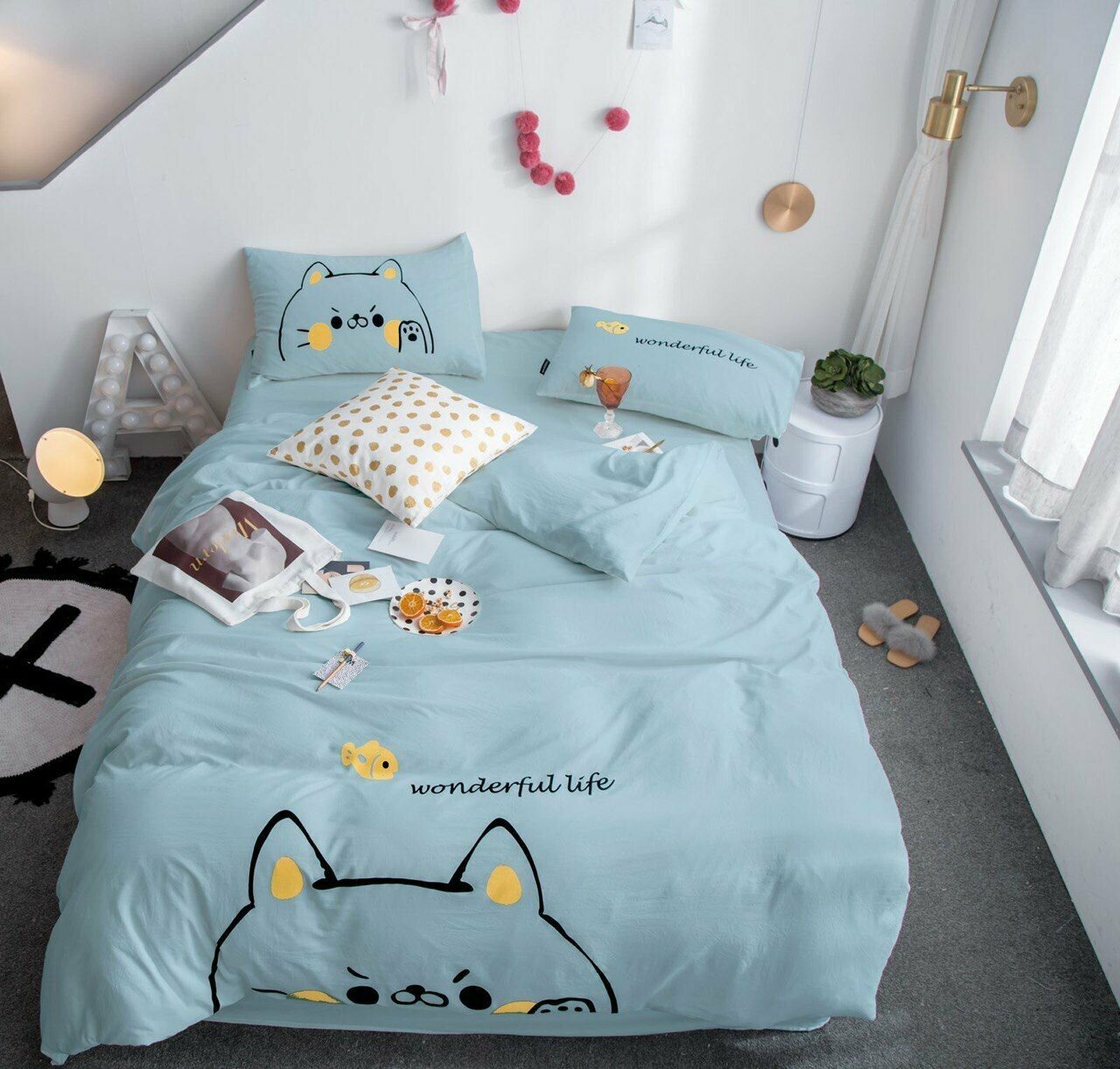 Детское постельное белье Mency 1,5 спальное сатин наволочка 50x70 голубой черный цвет