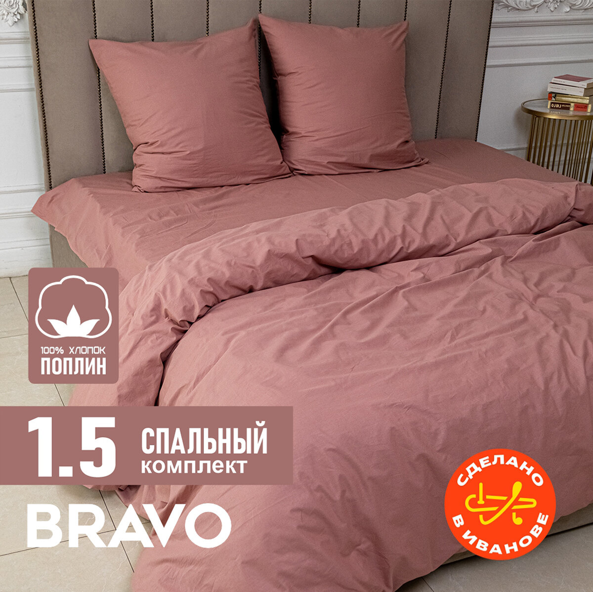 Постельное белье 1,5 спальный BRAVO поплин темно-бежевый/ хлопок / наволочки 70х70