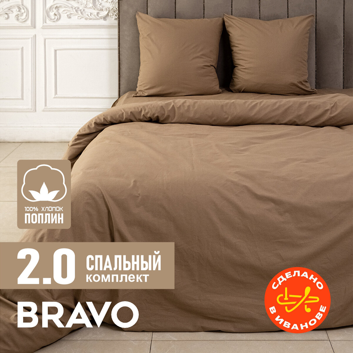 Постельное белье 2 спальный BRAVO поплин темно-бежевый/ хлопок / наволочки 70х70