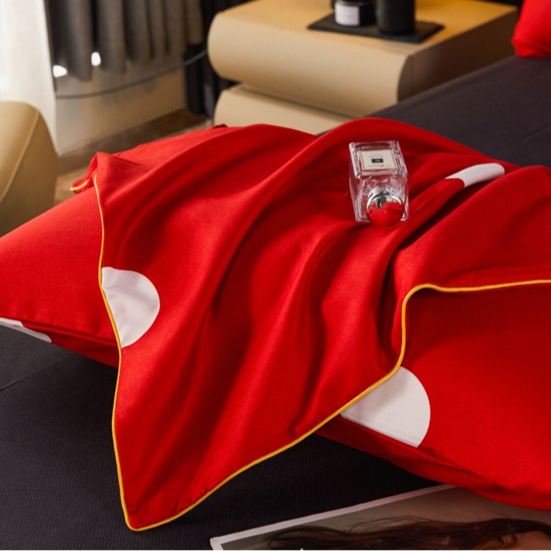 Постельное белье Alanna, 1.5 спальное, Бархатный сатин, Белый горошек на красном