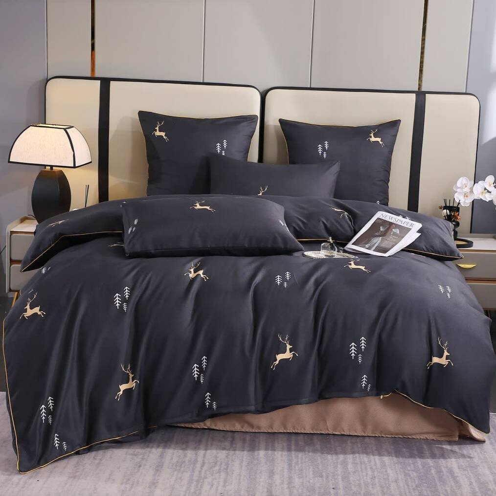 Постельное белье Alanna Comfort, 1.5 спальное, Бархатный сатин, Новогодние олени на черном