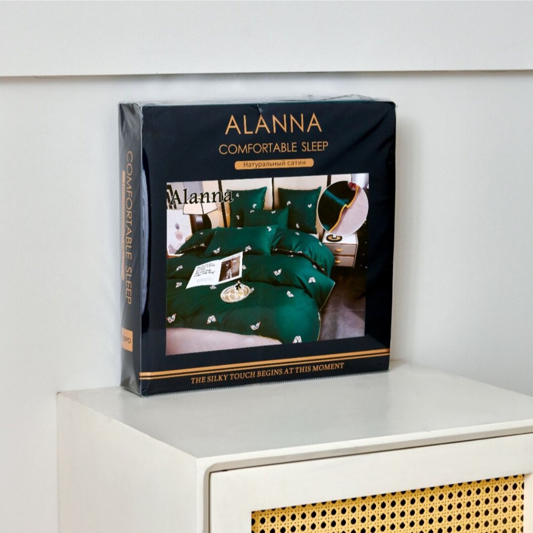 Постельное белье Alanna, Евро, Бархатный сатин, Бабочки на зеленом