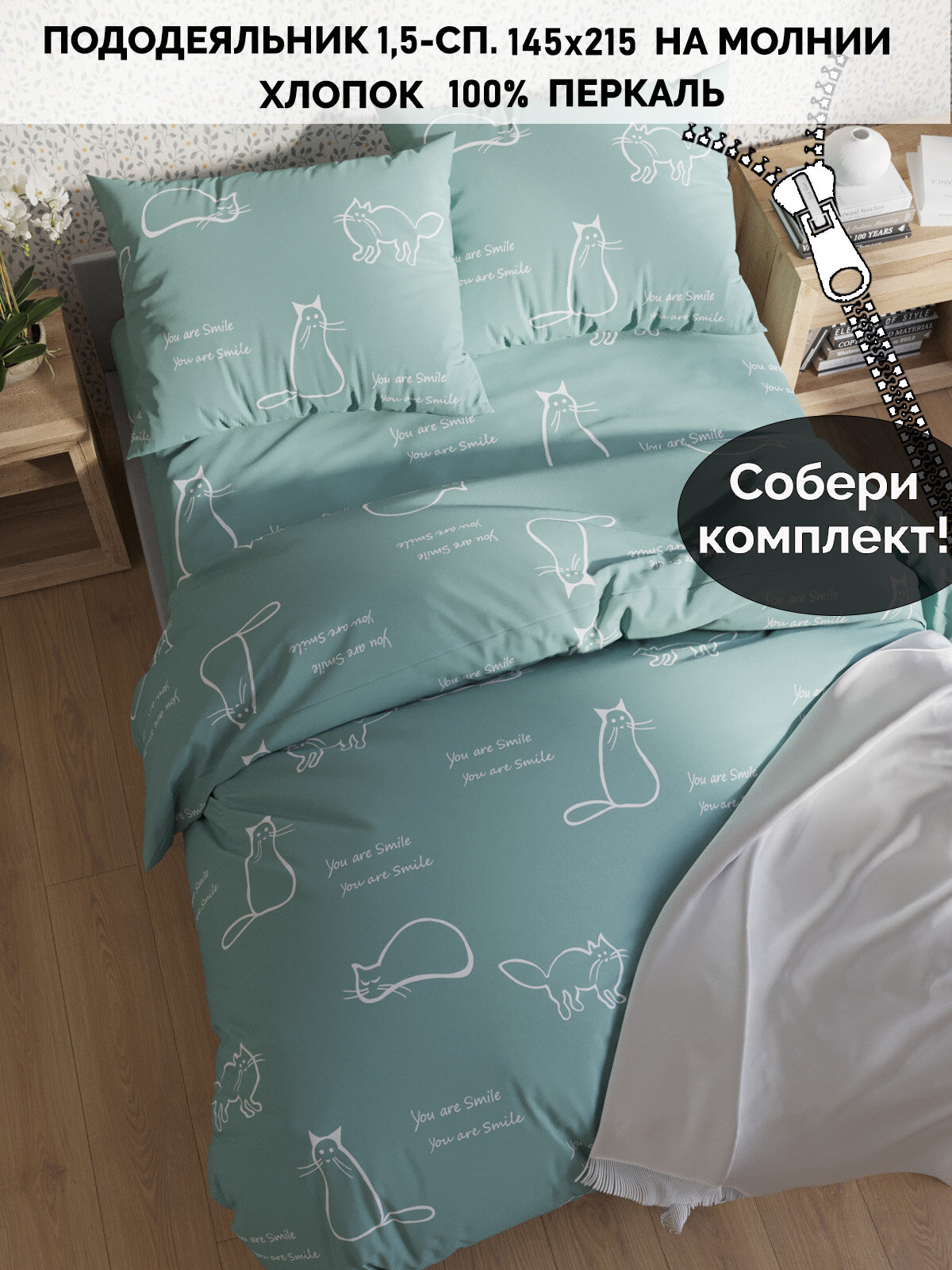 Пододеяльник Кот Коттон "Котики (мята)" 1,5-сп 145х215 см интересное: