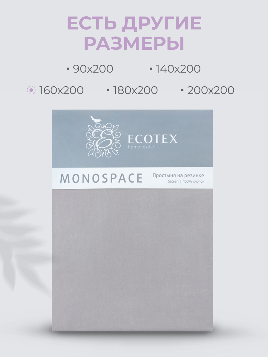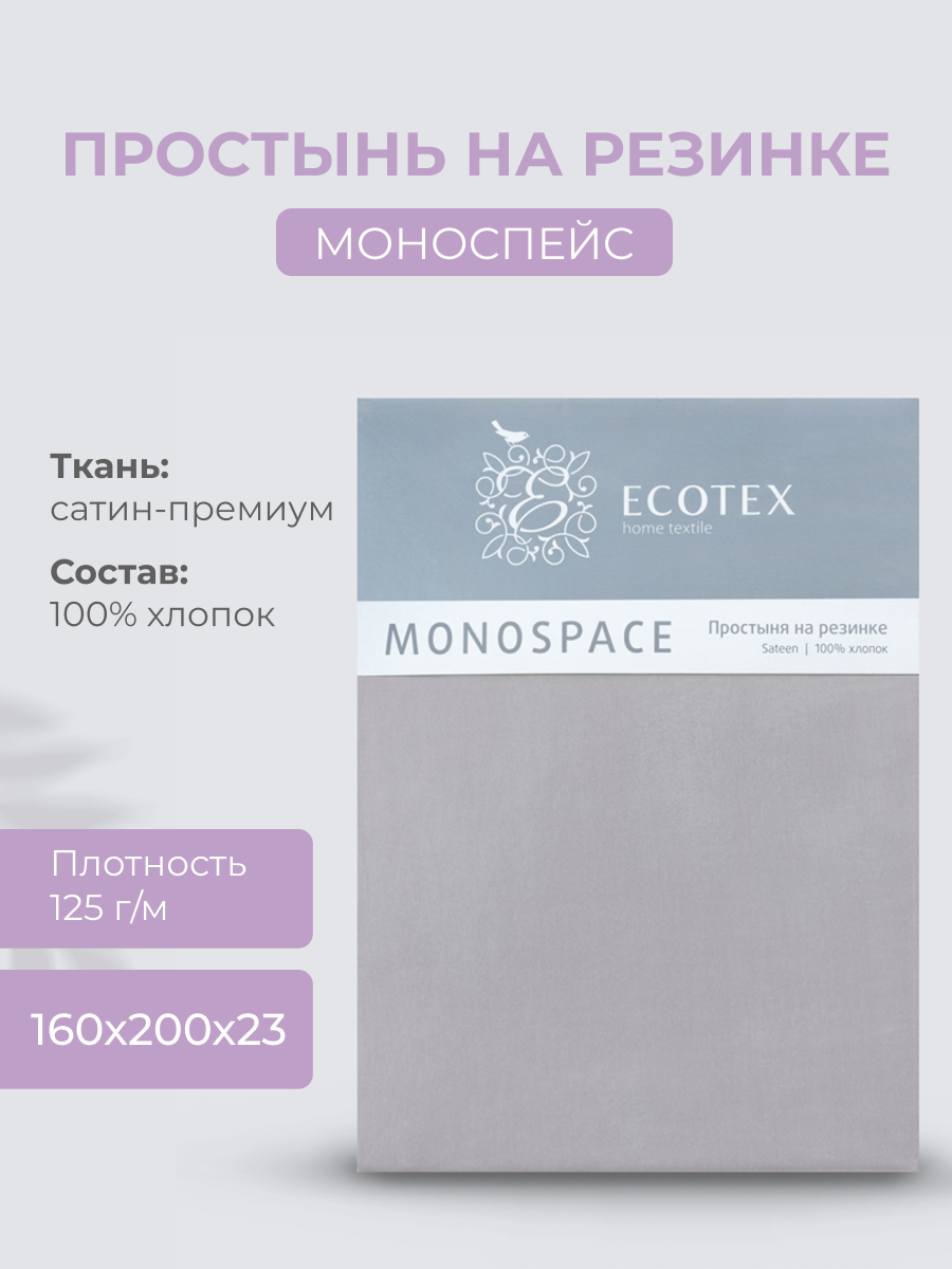 Купить Простынь на резинке Ecotex "Моноспейс", сатин - 100% хлопок, 160х200х23 серый