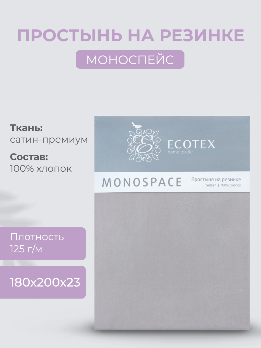 Простынь на резинке Ecotex "Моноспейс", сатин - 100% хлопок, 90х200х23 серый