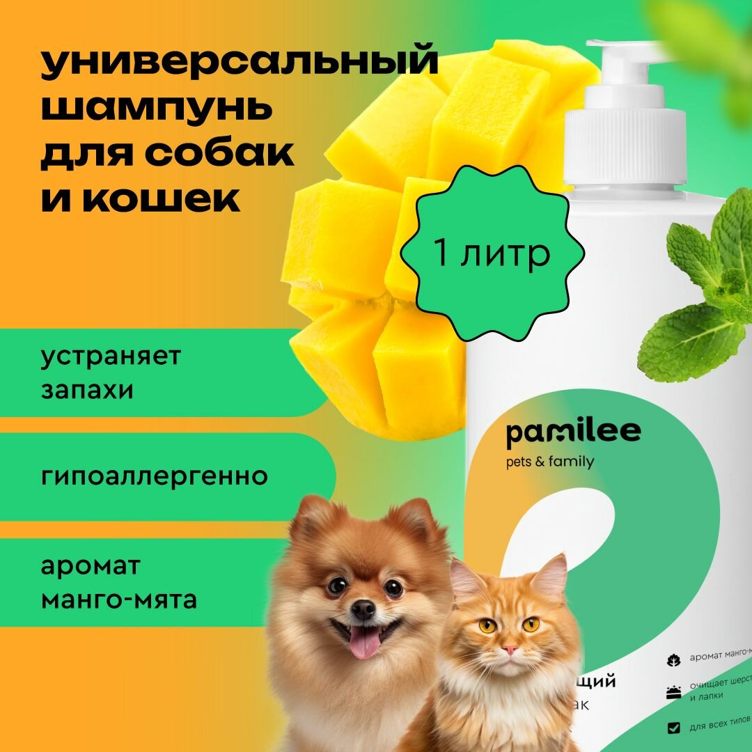 Шампунь для собак Pamilee с ароматом тропических фруктов, увлажняющий гипоаллергенный для всех типов шерсти, против сухости и зуда, 444 мл