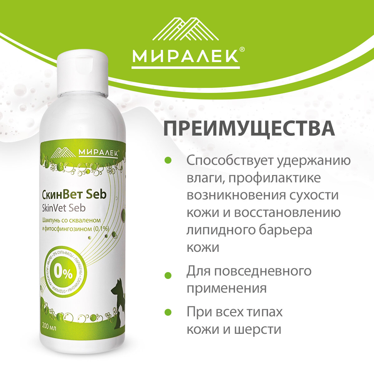 Шампунь для животных СкинВет Seb (со скваленом и фитосфингозином), 200 мл