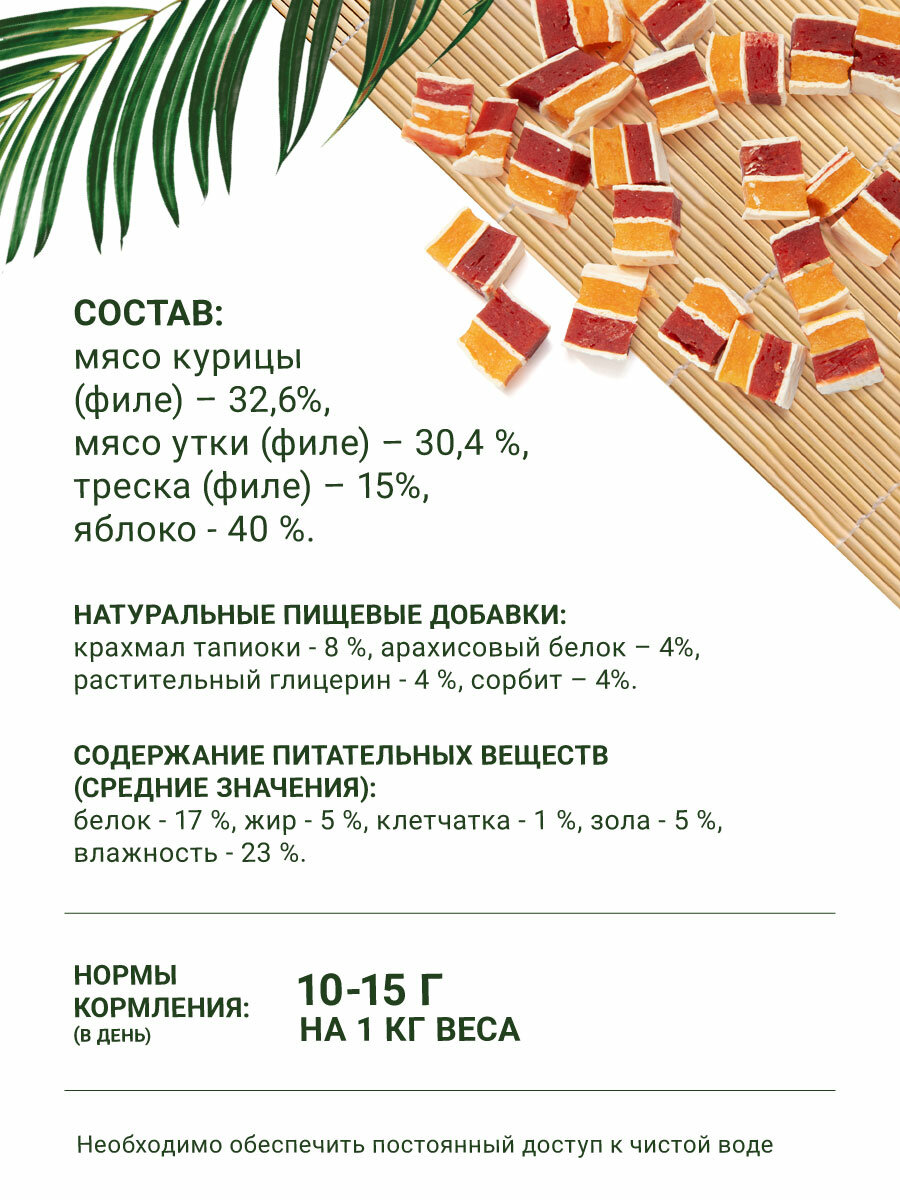| Состав | Лакомства для собак содержит: мясо утки, яблоко ,картофельный крахмал , сорбит, глицерин, соль. |