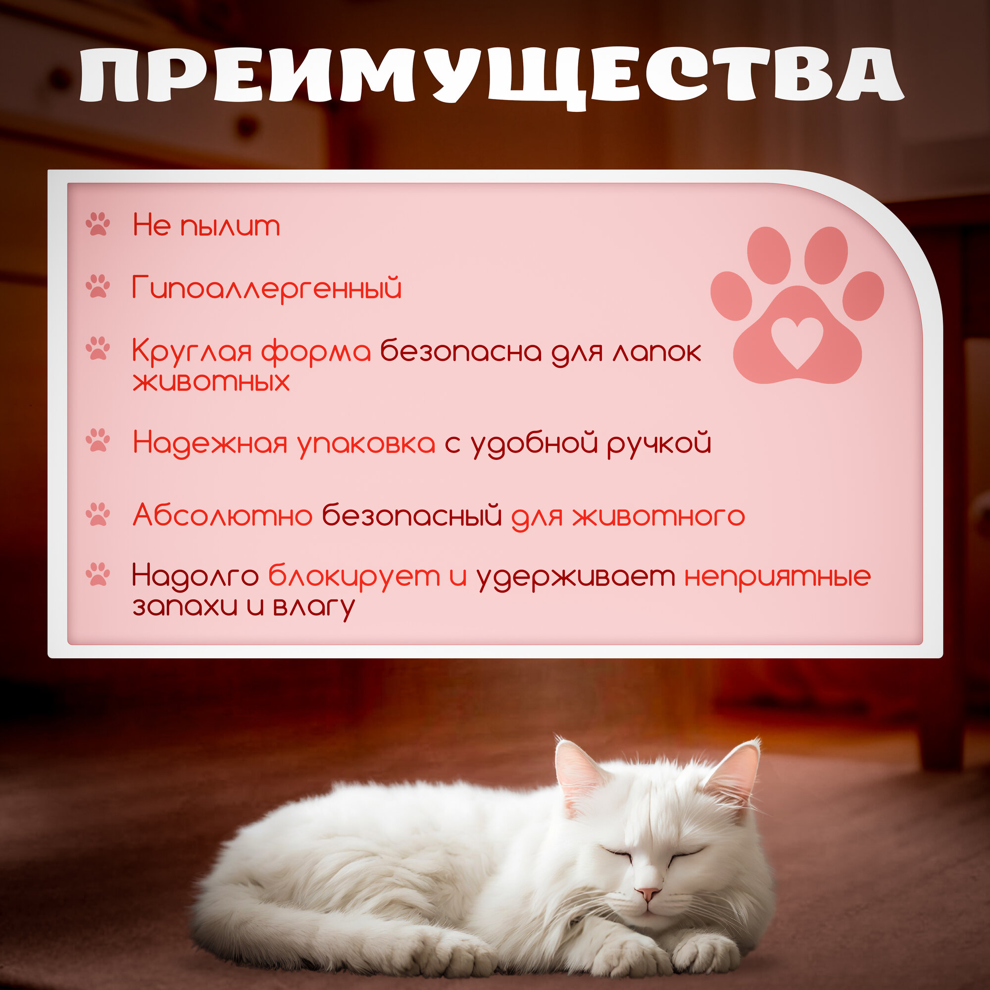 | Особенности | антибактериальный / гипоаллергенный / гранулированный / диагностический / для длинношерстных / для котят / контроль запаха / с защитой от запаха |